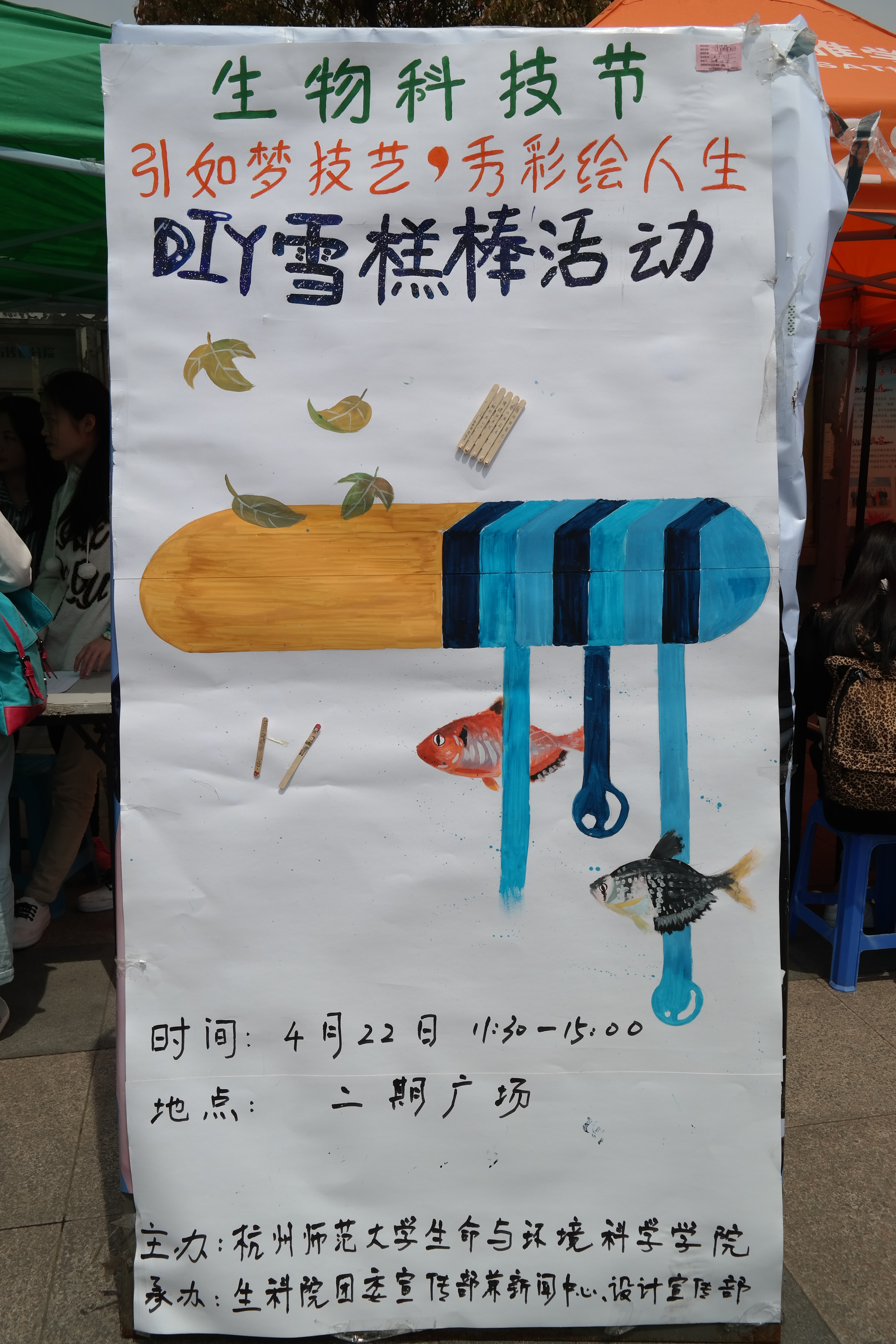 4月22日中午11点30分,在老王论坛 下沙校区二期食堂广场举办了由老王论坛 团学联团委宣传部兼老王论坛-老王论坛官方成人资源分享区和设计宣传部联合组织的生物科技节之“引如梦技艺,秀彩绘人生”雪糕棒DIY制作活动。活动当日,场地帐篷前人潮涌动,人气爆棚。