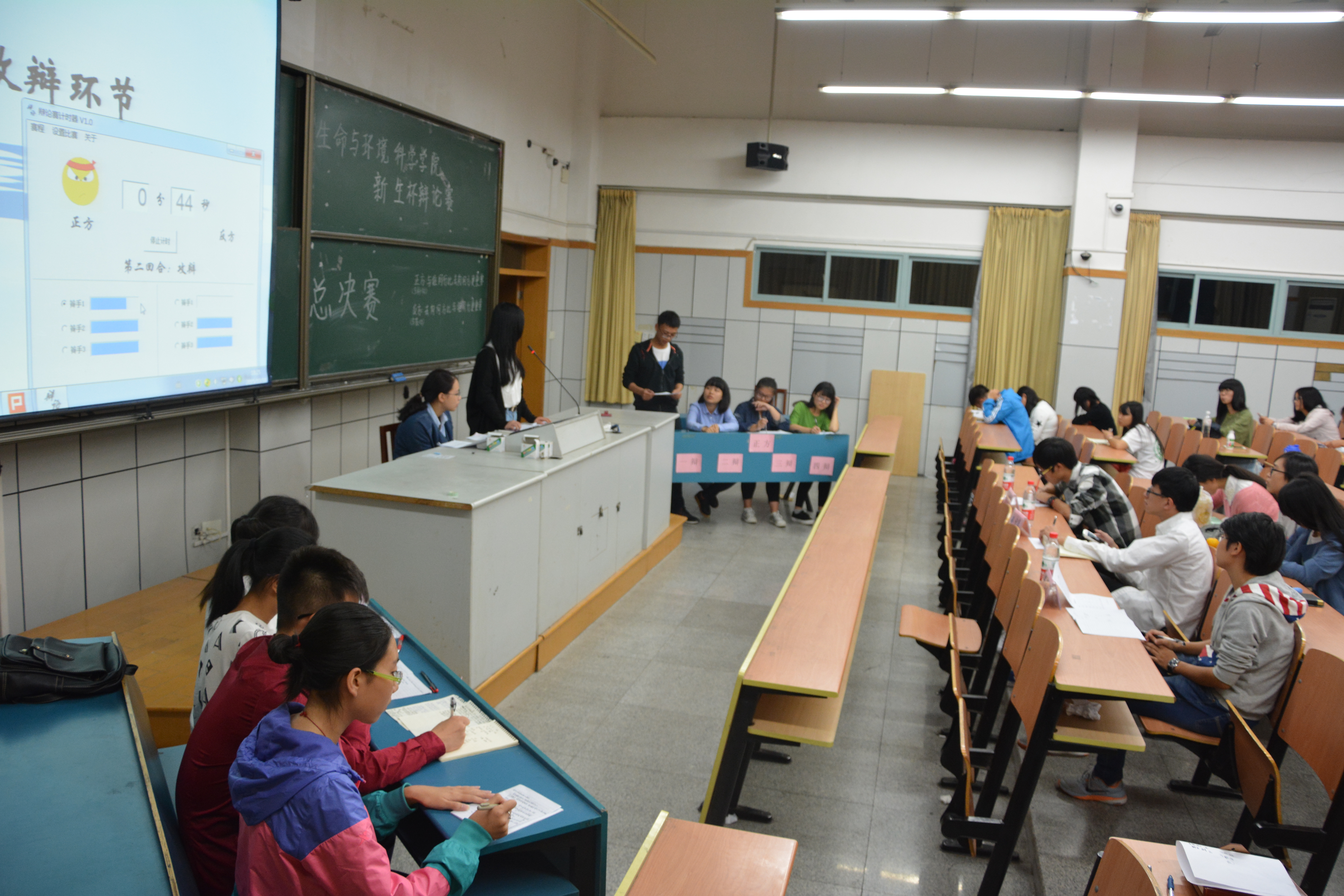 辩论赛的烽火由生科151与生技151点燃。继正方慷慨激昂、反方充满理性色彩的自我介绍后,比赛进入开篇立论环节。正方的一辩从人们生活方面的改善为切入点,用通俗幽默的快板式语言陈述己方“与谁同行比去向何方更重要”的观点。反方则从人的目标梦想等观点出发,进行层层剖析,论证己方“去向何方比与谁同行更重要”的观点。在随后的攻辩环节中,双方更是争锋相对、步步紧逼,现场气氛迅速升温,达到白热化阶段。