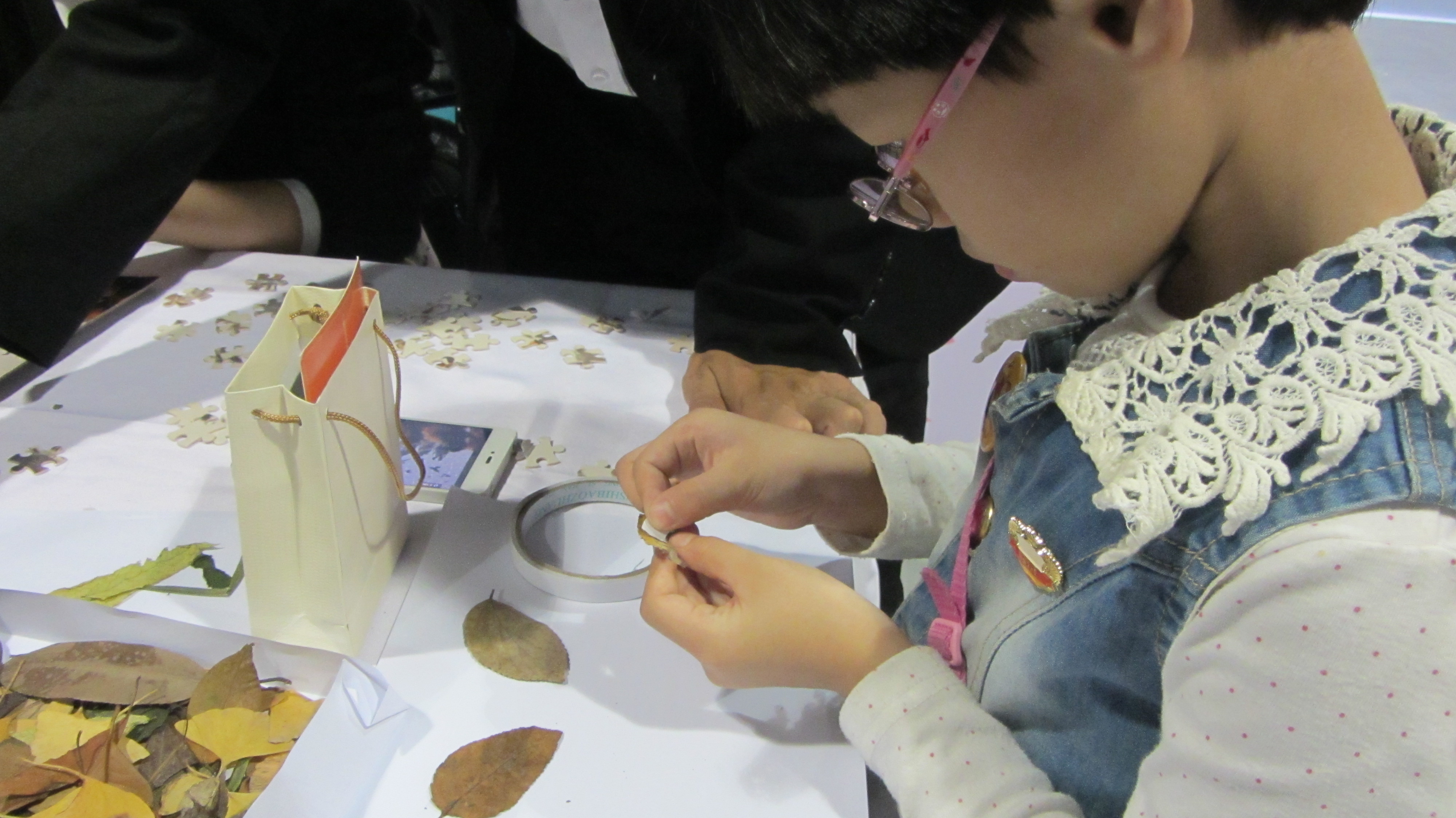 到达大学生创意生活节的展地杭州白马湖国际会展中心以后,"绿之翼"环保协会的社员们开始简单地布置场地,准备好互动的游戏材料——环保图案的拼图和树叶贴画。活动伊始,树叶贴画只吸引了小朋友的到来,随着背景墙上小朋友们充满想象力的贴画越来越多,开始有大学生甚至职场人士参与了我们的树叶贴画小游戏。用大自然的馈赠拼贴出一幅幅充满想象力的图画,展现了自然的魅力,这也时刻提醒我们保护环境与保护自然的重要性。