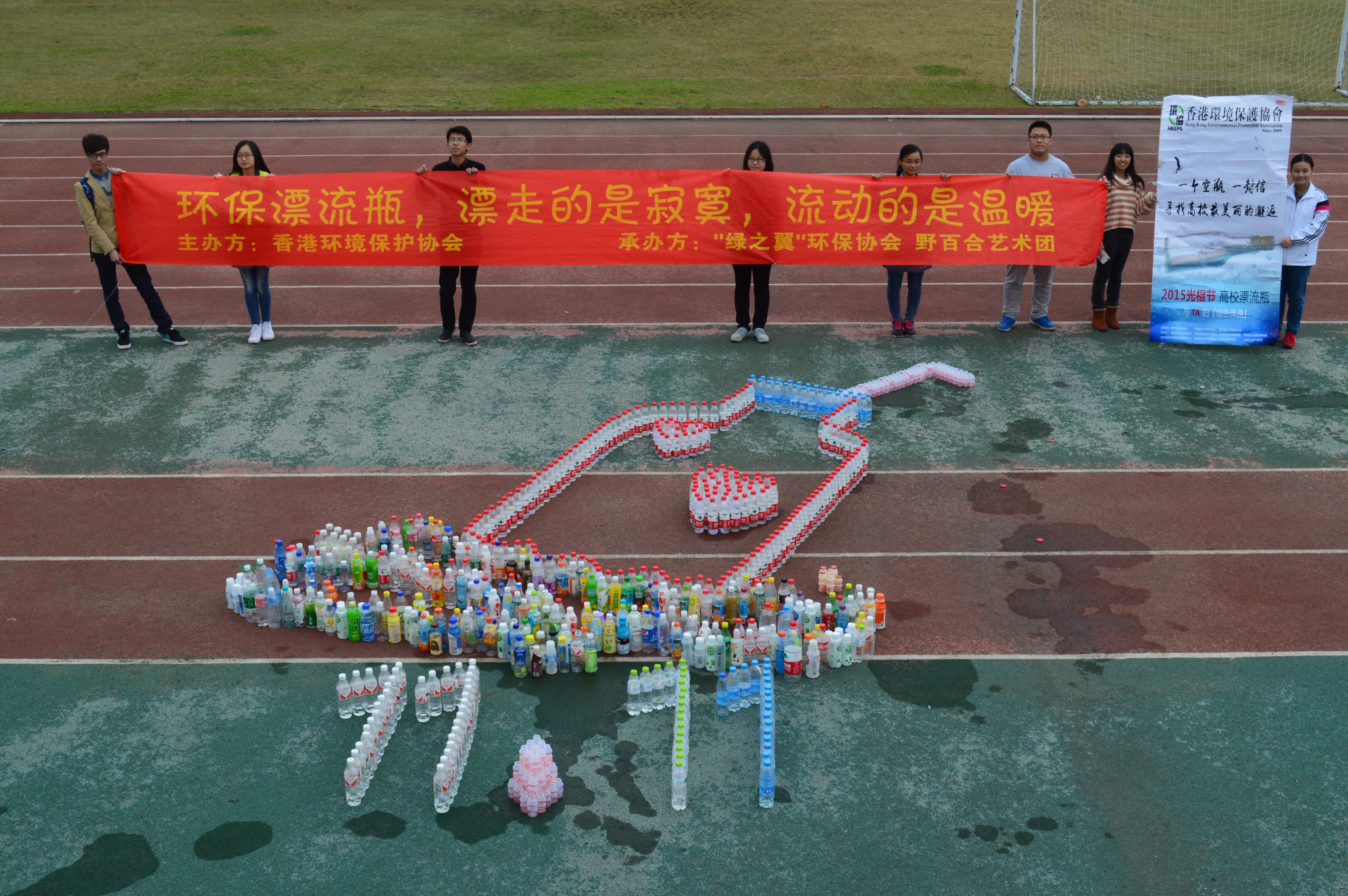 本次活动流程主要包括三个阶段,前期发动大家收集平时丢弃的空瓶子,并且给每一个空瓶子都塞上一张用废弃小纸条写的自己想要传递到远方的信息,中期在大学生成长指导中心对面开展外场,感兴趣的同学在干事们摘录的由香港环境保护协会收集统计的漂流信息中选取自己想要进一步联系的信息,由干事为同学们提供联系方式。后期活动为协会成员将收集到的所有瓶子在操场上摆出一个带心形的漂流瓶图样,符合本次活动的主题。“2015光棍节高校漂流瓶”活动为广大还未脱单的同学提供了一个交流的平台,让全国学子传递自己的祝福,发出自己的心声,勇敢喊出自己的梦想。与网络上虚拟的漂流瓶相比,此次实体漂流瓶活动让人更有真实温暖的感觉,不再是虚拟网络的冰冷。"绿之翼"环保协会为了吸引更多的同学参与到此次活动中来,为每位参与活动的同学准备了养乐多。随着活动的开展,参与到其中的同学们也越来越多,其中也有作交换生的外国友人,不少同学对此次活动表现出了浓厚的兴趣。