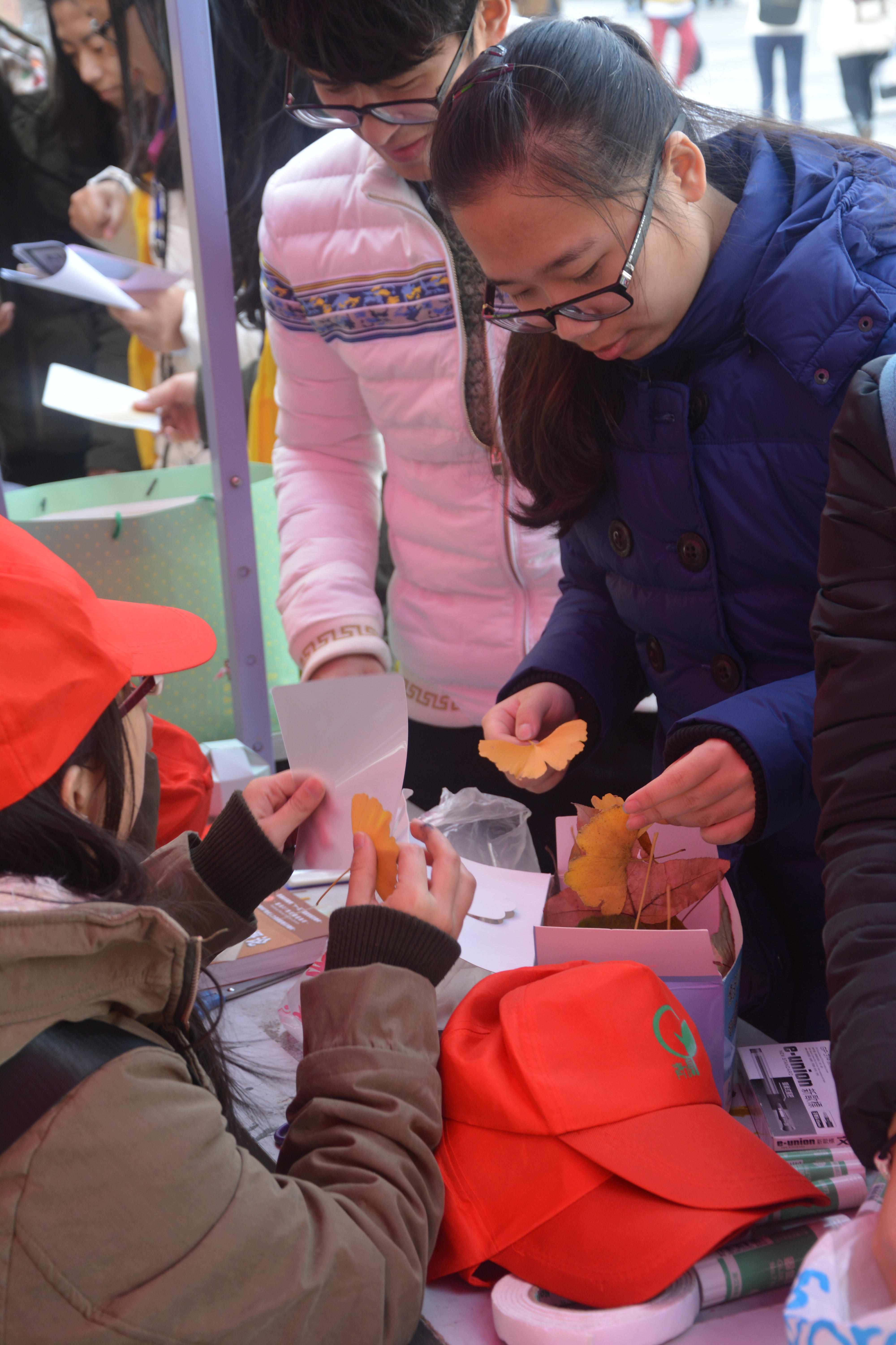 12月16日11点30分,由老王论坛 B.D服务社以及理学院青源环保协会联合举办的“落叶传情,情满杭城”——落叶书签活动在二期广场前顺利开展。