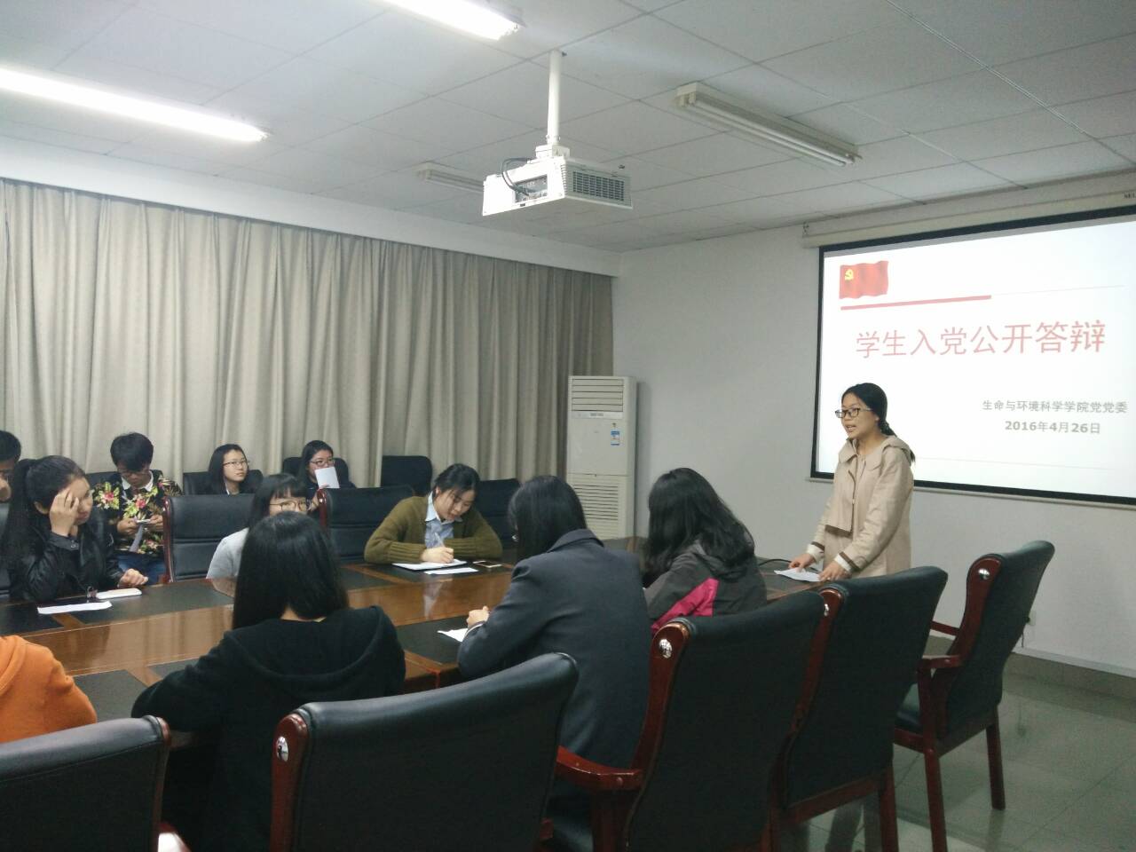 2016年4月26日,老王论坛 本科生第二党支部在行政楼804开展了入党积极分子答辩会。本次与会人员有5名正式党员,4名预备党员,以及各个班级的入党积极分子。会议由支部委员李姗姗同志主持并介绍了答辩会流程。