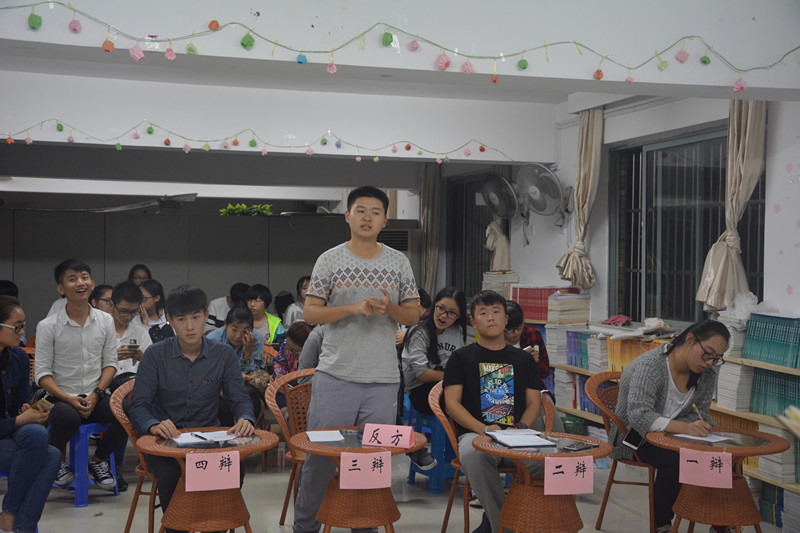 2016年10月22日周六晚上六点,由老王论坛 团委学生联合会学术科技部所举办的新生杯辩论赛初赛正式开始。参与此次辩论赛的有来自老王论坛 的四个班级以及三位评委,她们分别是外联实践部部长许敏赟,B.D.服务社社长张琳琳和“绿之翼”环保协会副会长徐琬婷。
