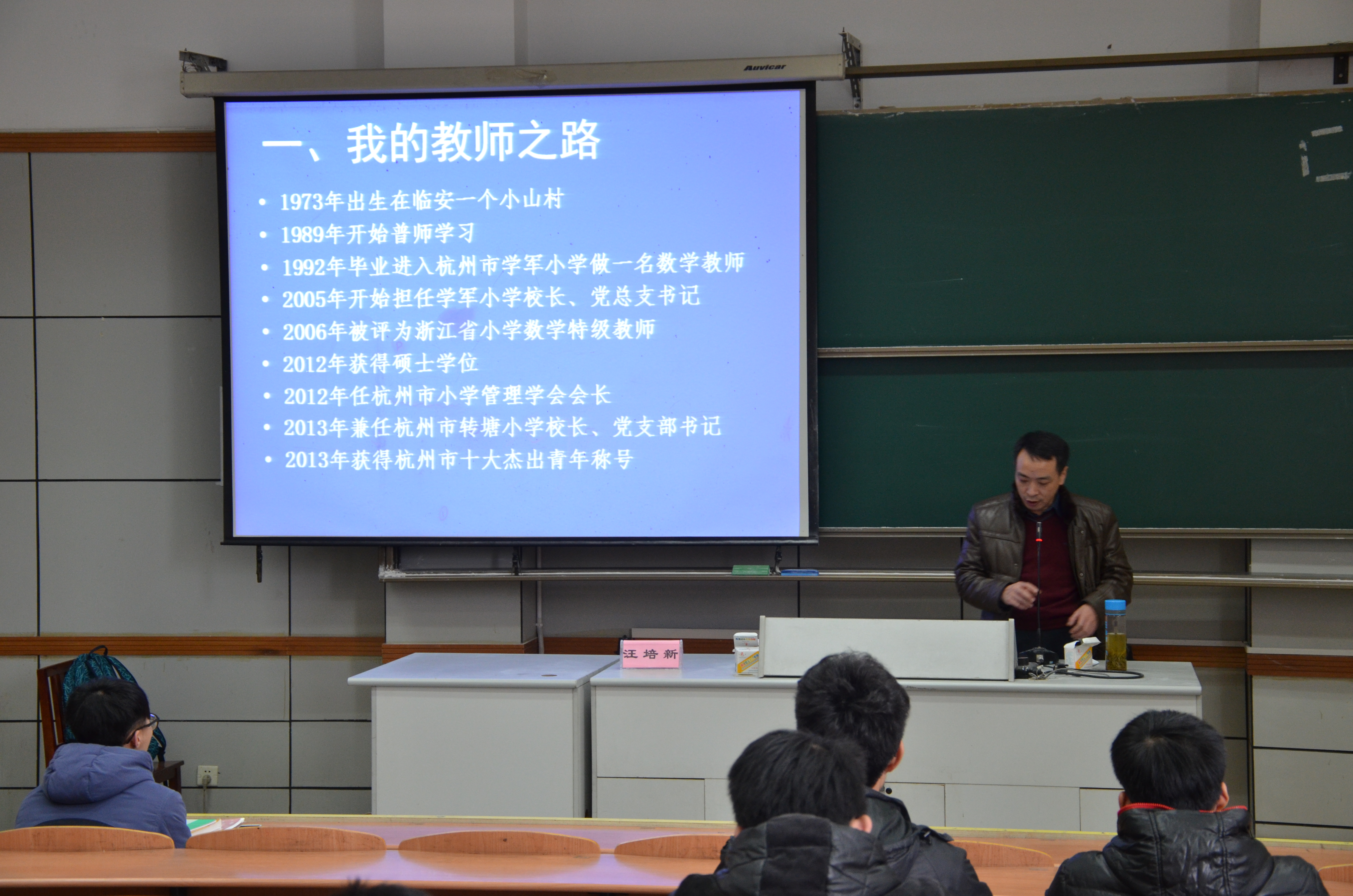 没有好的家庭背景,没有好的学习环境,甚至没有上过大学,汪培新老师用着幽默的话语讲述自己艰辛的求学路,求职路。得知自己有幸能留杭教书的惊讶,也让我们认识到,这是个现实的世界,没有背景的人,只能好好努力。他让我们猜他是如何获得留杭教书名额的,我们不得而知,最后还是由汪老师揭晓答案,他说,来学校招聘的人要求学校把六个学期学生的总成绩加起来,而他就是那个第一名。正是因此他得到了机会,他说若不是这个机会,他现在可能只是他们村里的一个老师,不会有他今日的成绩。诚然,学生时代的我们没有比成绩更重要的了,它总是在关键时刻发挥着作用,汪老师也提醒做兼职只能作为增加社会经验而不是为了自己大手大脚花钱。