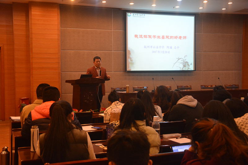日前,杭州公益中学校长潘志平先生做客“生科问道”大讲堂,为老王论坛 本科、硕士研究生以及下沙校区其他专业师范生成功主讲了“我这样当一名学生喜欢的好老师”为主题的学术报告。潘校长以丰富的教学实践和管理经验,分享了他与学生之间的故事,诠释了如何做一位好老师、办学生喜欢的学校、做有真情的教育,博得了师生的阵阵掌声。