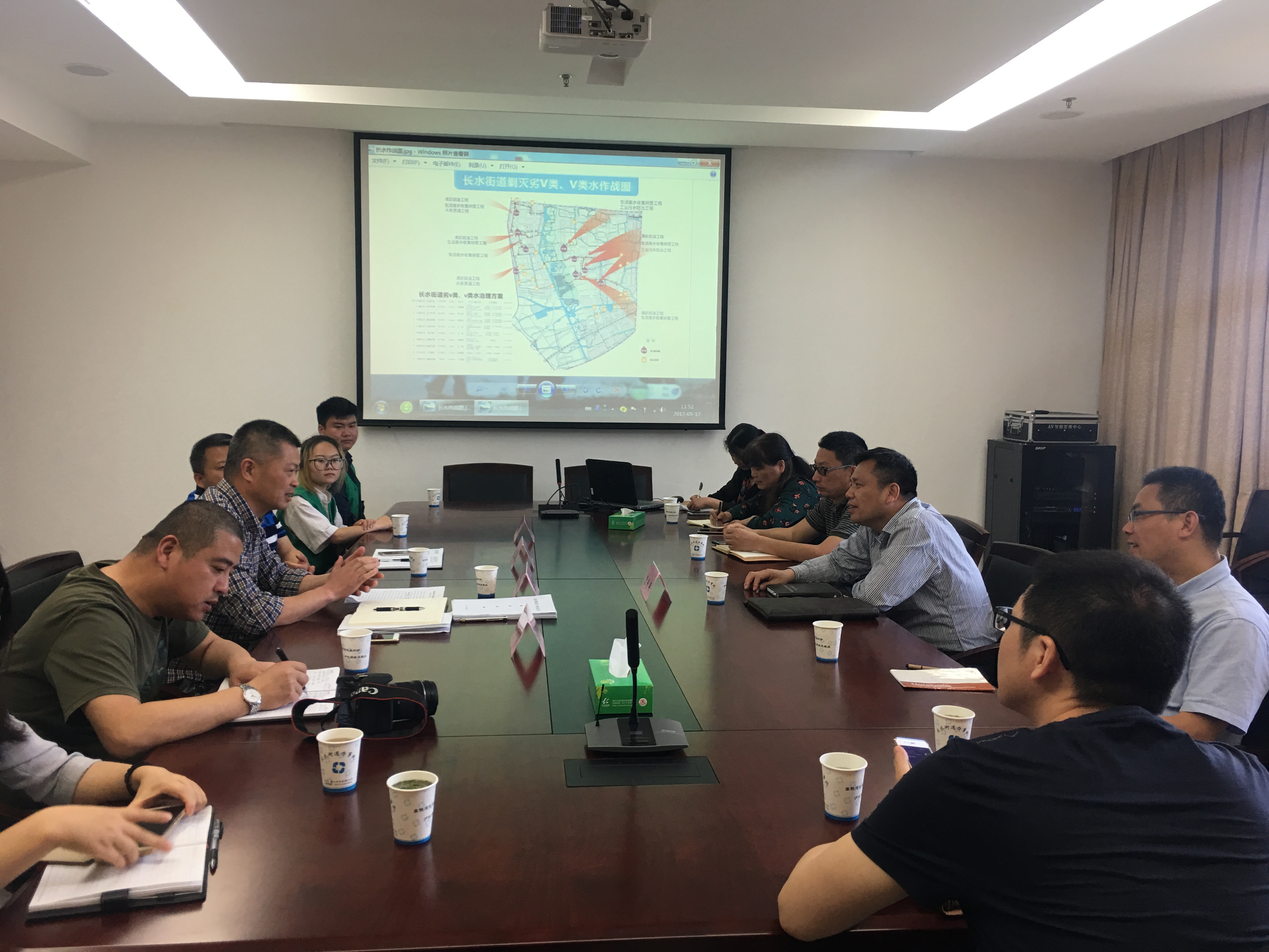 首先,由五水办负责人介绍了街道“全面剿灭劣Ⅴ类水,率先剿灭Ⅴ类水”的工作情况。张主任从街道辖区水质情况、目前主要工作措施,以及未来工作设想三方面展开介绍。塘汇街道现有各类河道18条,均已落实河长及责任部门,水质总体上以Ⅲ类和Ⅳ类为主。为进一步向“绝不把污泥浊水带入全面小康”的总目标迈进,街道牢固树立“一盘棋”思想,加强各部门工作协调,强化责任落实,并从截污纳管、清淤疏浚、产业整治和生态修复等方面进行工作开展和推进。在会议的最后一环节,张主任为小分队成员展示了《塘汇街道河长制河道水环境综合治理管理分工平面图》,图中标明了沿河企事业单位分布,明确各河流段的治理监管责任。