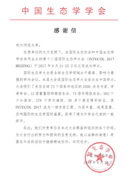 近日,我校收到中国生态学学会(国家一级学会)的感谢信,中国生态学学会对我校在第十二届国际生态学大会(INTECOL 2017)的筹备和组织等各个阶段中给予的支持表示诚挚感谢。