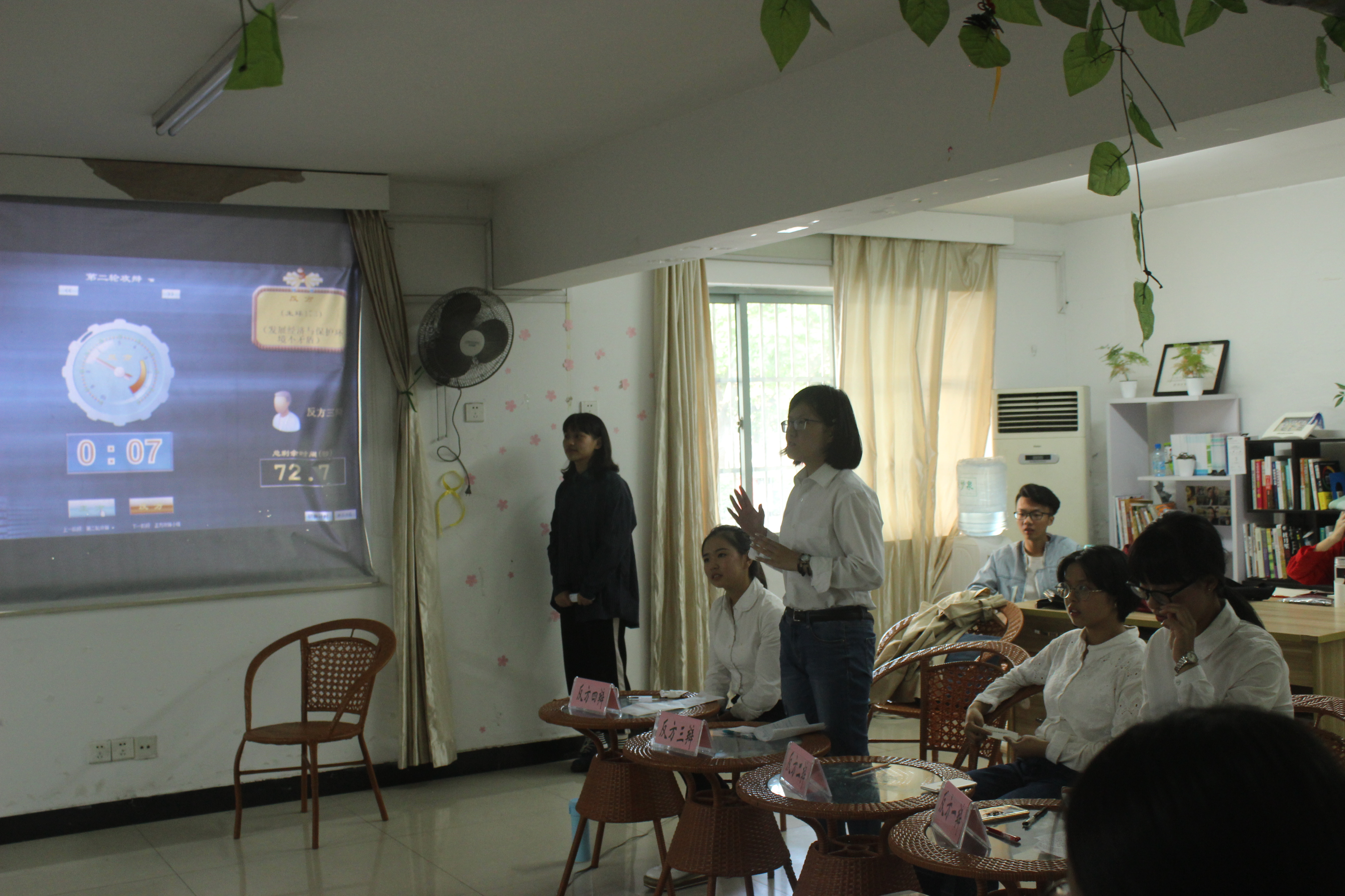在第一个立论环节,正方根据他们的观点“发展经济与保护环境是矛盾”先发制人,用有条理并且强有力的依据完美的表达出他们的立场。他们认为,矛盾是始终都存在,同时他们也引用了十九大方面的内容,使他们的论点更加有力。但反方同样不甘示弱,事实胜于雄辩。她们根据历史上田纳河的治理与美国经济的高速增长让裁判和观众信服。在攻辩环节,正反方的相互攻辩,一攻一守,精彩绝伦,让所有人为他们的口才喝彩。他们不急不躁,有条有理,让整个赛场在平淡中又有一丝火花。自由辩论中,各个辩手配合默契,他们妙语连珠,当仁不让;他们旁征博引,将整个比赛又带到另一个高潮。辩手们的精彩表现和幽默口才,给紧张的辩论赛带来了一阵清风。在最后的总结陈词环节,双方的四辩分别从对方先前的环节中找出漏洞,逐一回击,思路清晰,思维敏捷。反方坚持引用中国“既要绿水青山,也要金山银山”这是不矛盾的观点进行陈述。然而正方也从反方中关于修建铁路和关于沙漠化的理解找出漏洞,并用逻辑清晰的总结,让现场掌声不断。