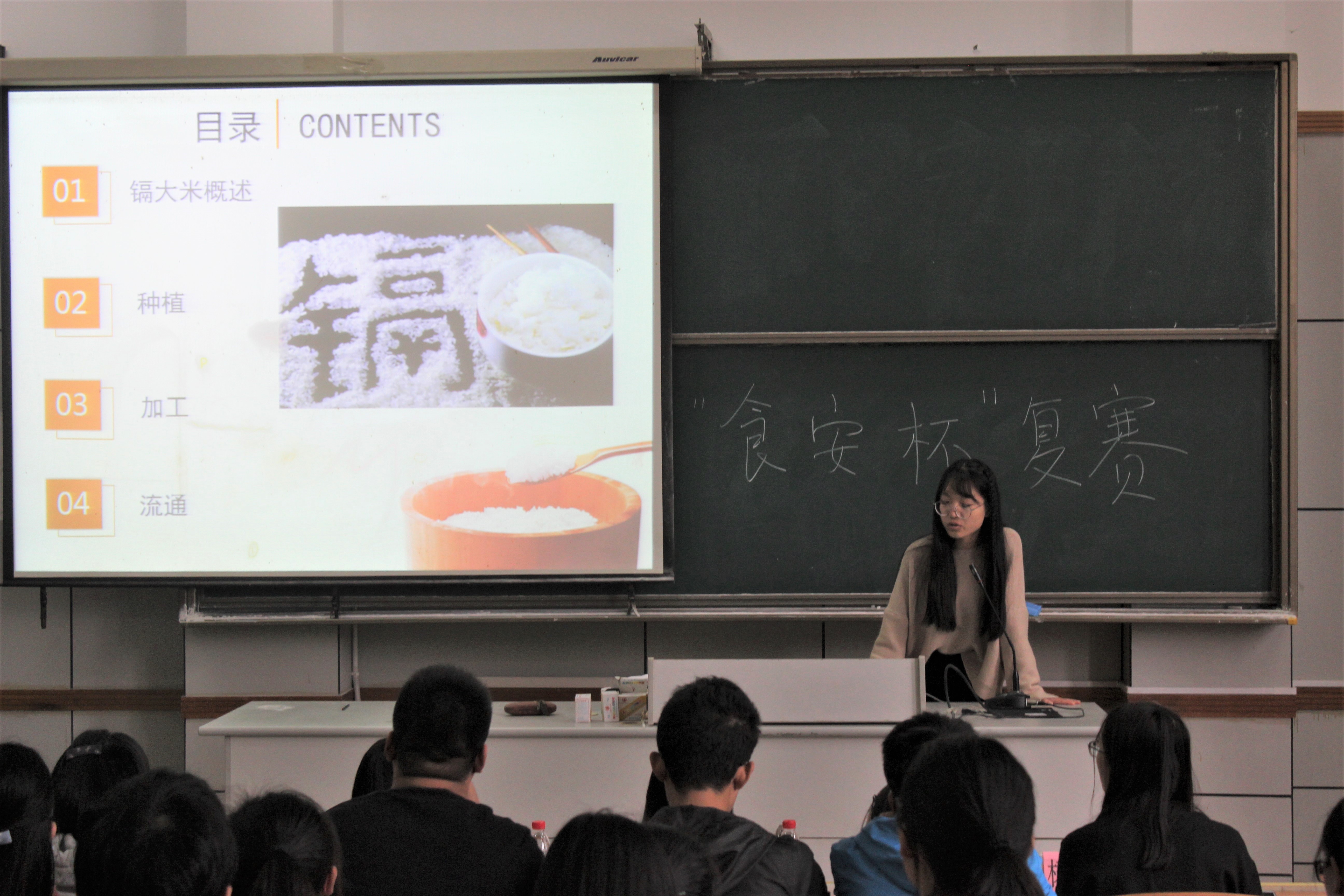季军组“稻义队”从“镉大米”事件引出主题“如何保证大米的食用安全”,论述了如何做到从田间到餐桌的质量把控。结束介绍后,,周婷老师亲自上台指导,现场气氛活跃。