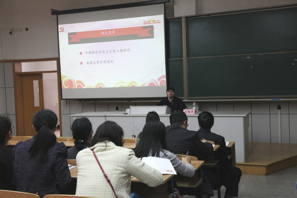 校党委宣讲团应维华老师作题为“坚定文化自信,讲好中国故事”的十九大专题辅导报告,应老师从“一个主题、十大成就、两大变革、两个不变、一个使命、一个重要思想、两个百年和九方面指导”等八大版块介绍了十九大报告的主体内容。并从中国共产党人的初心和使命,就是为中国人民谋幸福,为中华民族谋复兴。全党要自觉地增强道路自信、理论自信、制度自信、文化自信。报告指出,“文化是一个国家、一个民族的灵魂。文化兴国运兴,文化强民族强。没有高度的文化自信,没有文化的繁荣兴盛,就没有中华民族的伟大复兴。”中国共产党党员一定要自觉担负起新的文化使命,在实践中进行文化创造,在历史进步中实现文化进步!