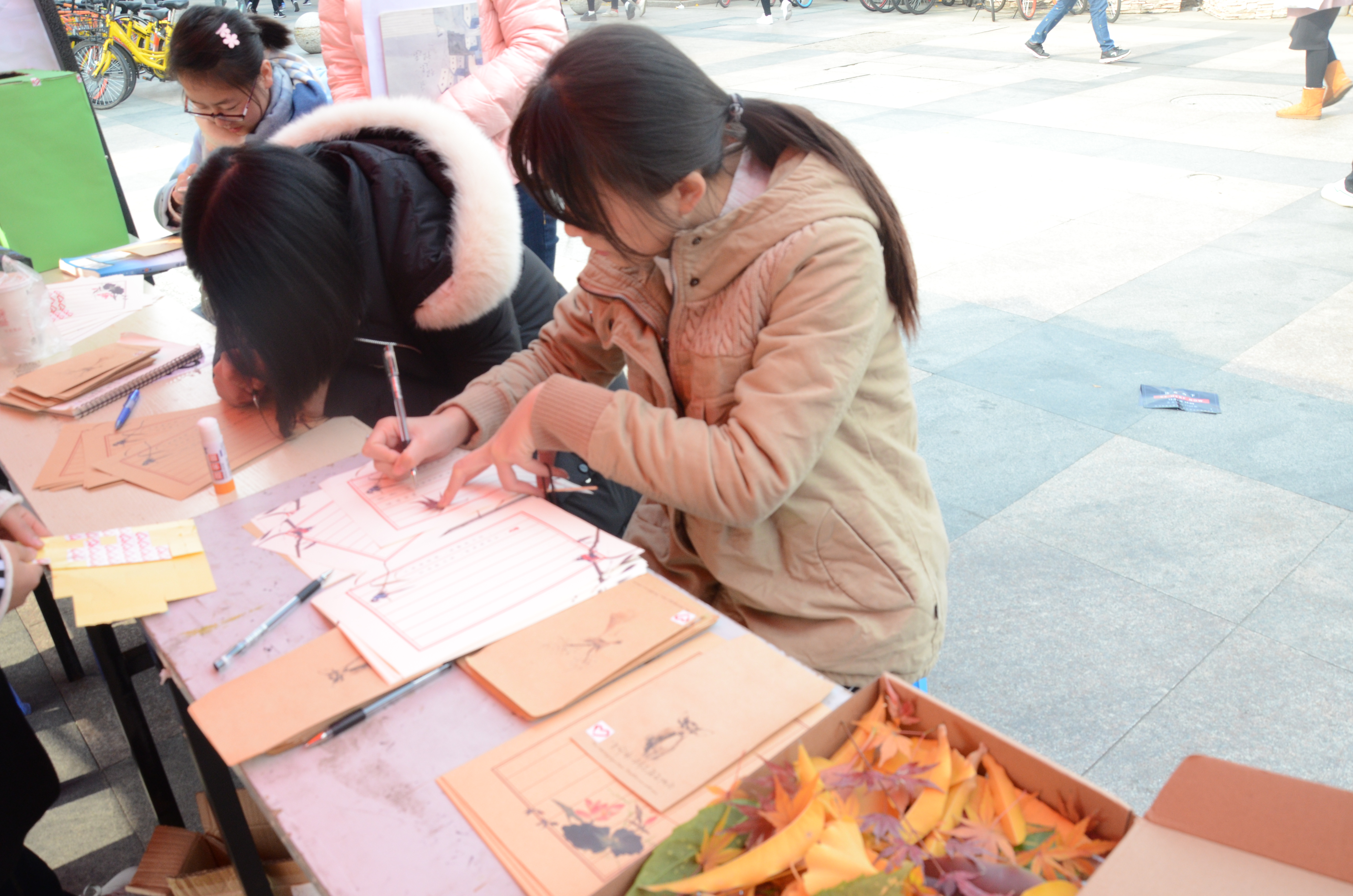 活动主要分为两部分:秋叶寄语和落叶清扫。秋叶寄语在二期广场进行。同学们在外场挑选落叶后写下寄语,以匿名信的方式寄给杭师下沙校区的任意一名学生,由青协负责寄送。同学在精致的信纸上写下对他人想说的话,为这个寒冷的季节增添了一丝温暖。相信收到落叶信的同学们心中也多了一份抵挡冬日寒风的温情。