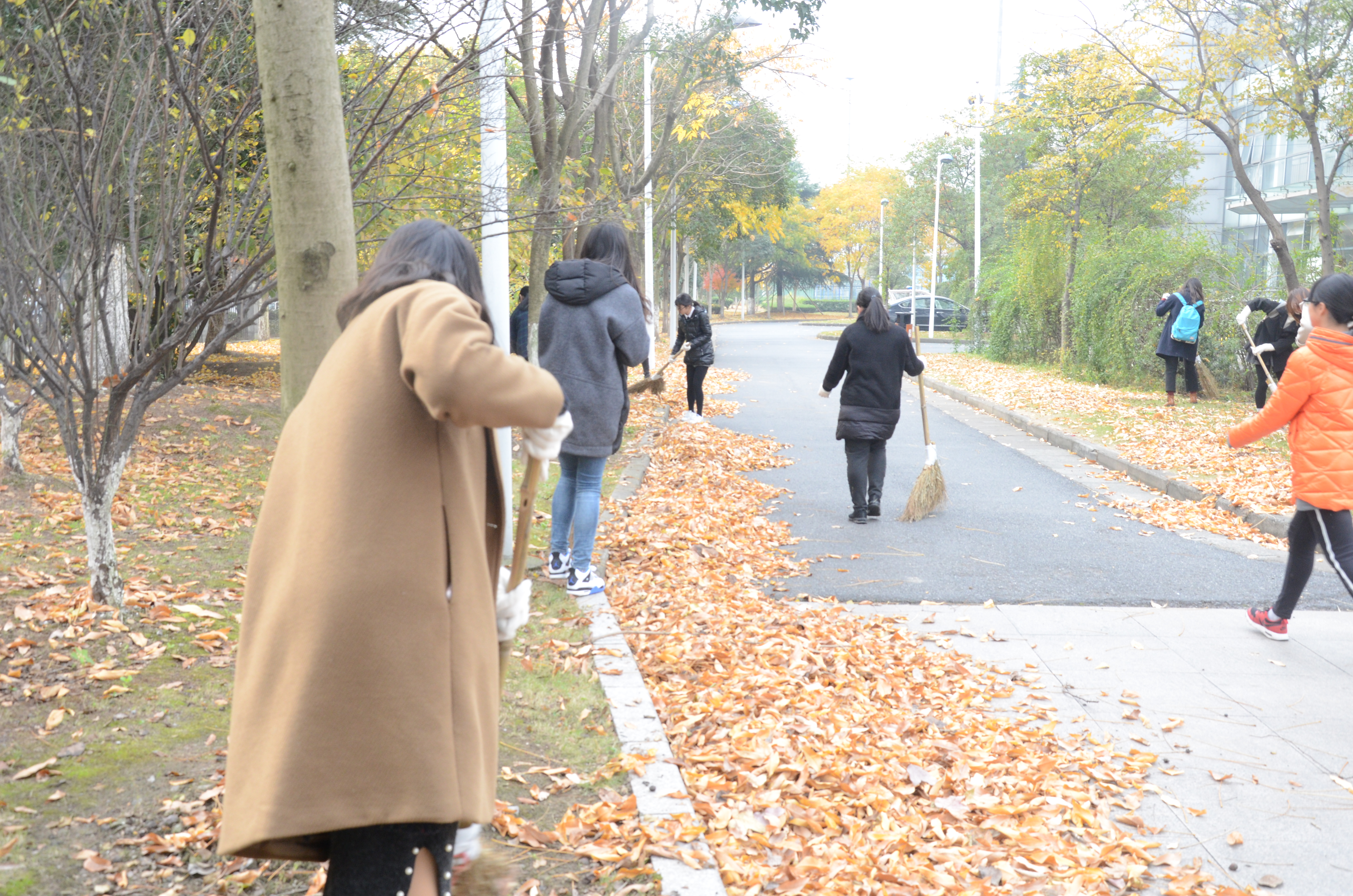落叶清扫在艺术楼前的行道树旁进行,由后勤阿姨指导志愿者们以及青协负责人员对落叶进行清扫。志愿者们不畏天气寒冷将落叶集中清扫到路旁,减轻了后勤阿姨的工作量。清扫落叶的同时,志愿者们也纷纷拿出相机,在相机里留下了校园里秋日的痕迹,让冬日里的校园更加干净、整洁。