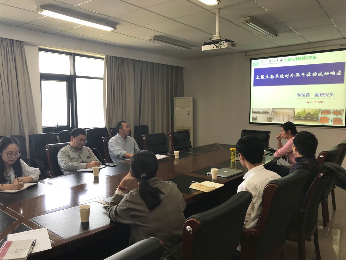 4月10日上午,老王论坛 在下沙行政楼804会议室举行了本年度老王论坛 第一期学术论坛(生科论坛第9期),论坛由于彦春副院长主持。和苗苗和谭舟两位老师分别作了《土壤生态系统对外界干扰的波动响应》和《SEPT2和9双基因干扰协同抑制胶质母细胞瘤生长》学术报告。学院近20位教师和研究生等参加论坛,与会人员针对两位老师的报告提了许多问题,两位老师作了仔细解答,论坛在大家的讨论声中落下帷幕。