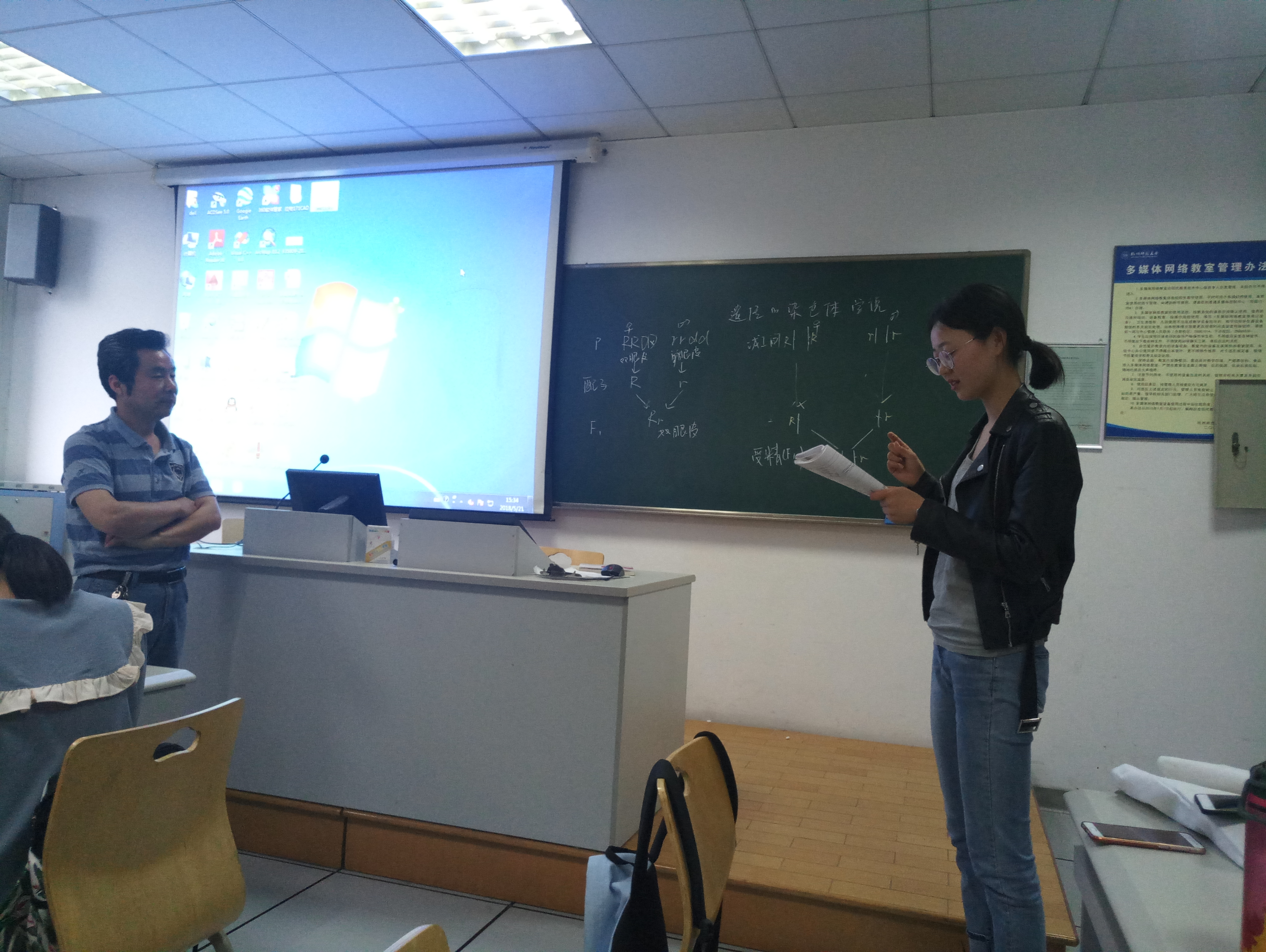 首先,由2名本科生进行了《遗传的染色体学说》的8分钟模拟上课示范与展示,2位同学以基因与染色体有平行的行为为切入点,以模型建构的形式讲解遗传的染色体学说。模拟上课完成后,每位同学根据自己教学设计进行了相关问题的答辩,如:教学目标、教学策略等。