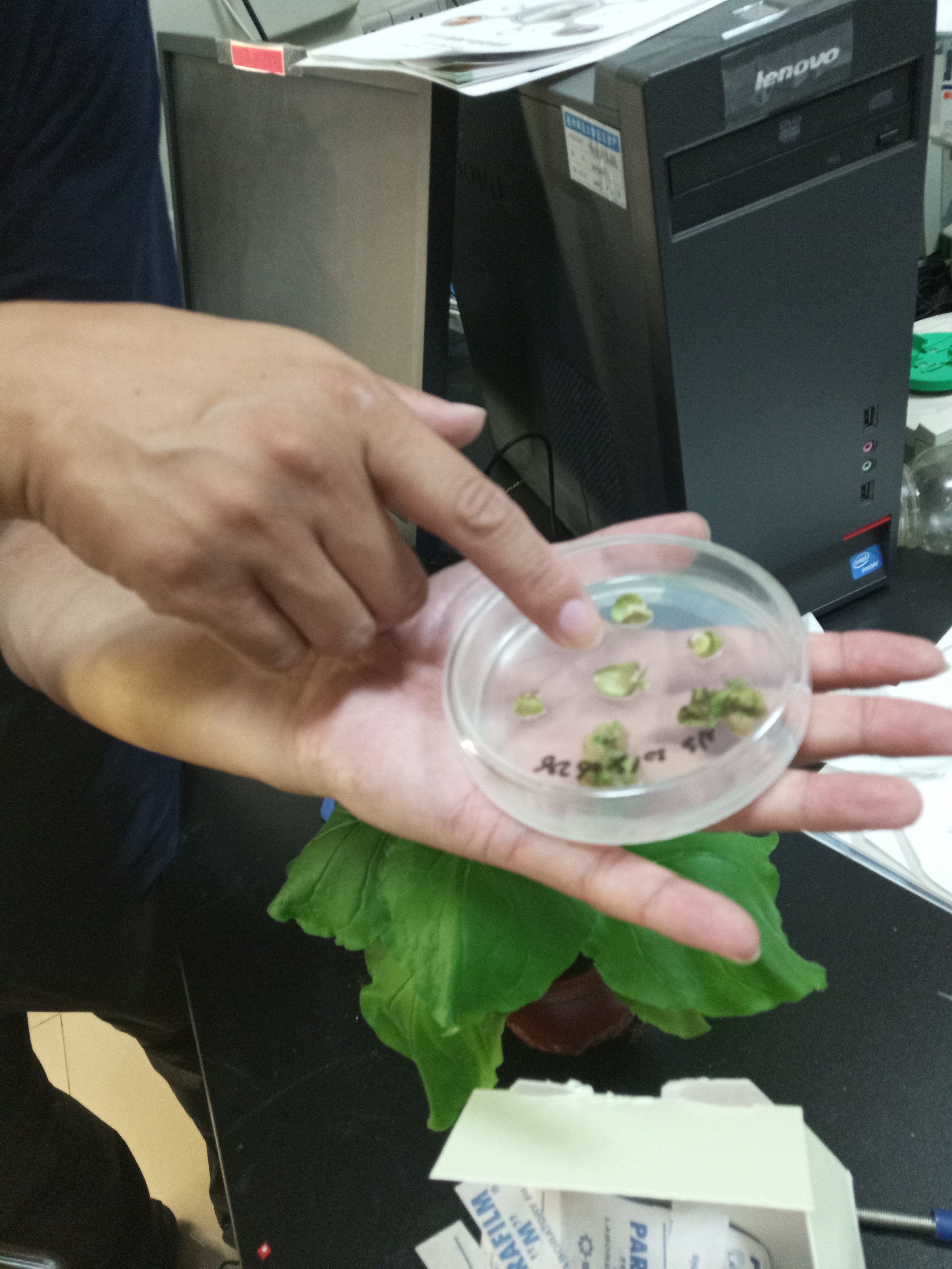 首先,张弦老师带领小组成员在一个温室中参观了一批转基因的烟草类植物,展示了该转基因的植物在紫外线的照射下叶片会发出绿色荧光的现象。同时张弦老师也讲解了转基因技术的大致的发展史,从其最早出现在1982年到转基因技术在烟草中的应用及其商业化。转基因技术最常用的农杆菌转化法的大致原理以及其的广泛应用都让小组成员先对转基因技术有了初步的认识。然后,小组成员在张弦老师的带领下来到了一批转基因植物的培养实验室,张弦老师为小组成员展示了还未移植入生根培养基的一些转基因植物,包括了这些转基因植物在培养基上生长发育的各种阶段。在展示过程中,张弦老师也讲解了培育转基因植物的的具体步骤,以及检测其是否转入了目标基因的PCR杂交的方法还有在其结出果实后检测其转入基因的数目。在培养基生长的转基因的铁皮石斛也让小组成员眼前一亮。随后张弦老师带领小组成员参观了一系列分子生物学所要用的仪器,检测DNA核酸跑胶的仪器,能够全自动提取DNA和RNA的自动核酸提取仪等等一系列小组成员之前闻所未闻的仪器。而在另一件温室中参观了转基因拟南芥植株,转基因大麦植株以及用于高温蒸汽灭菌法的灭菌锅。最后在实验室里参观了PCR仪,酶标仪,用于测核酸浓度的仪器等。