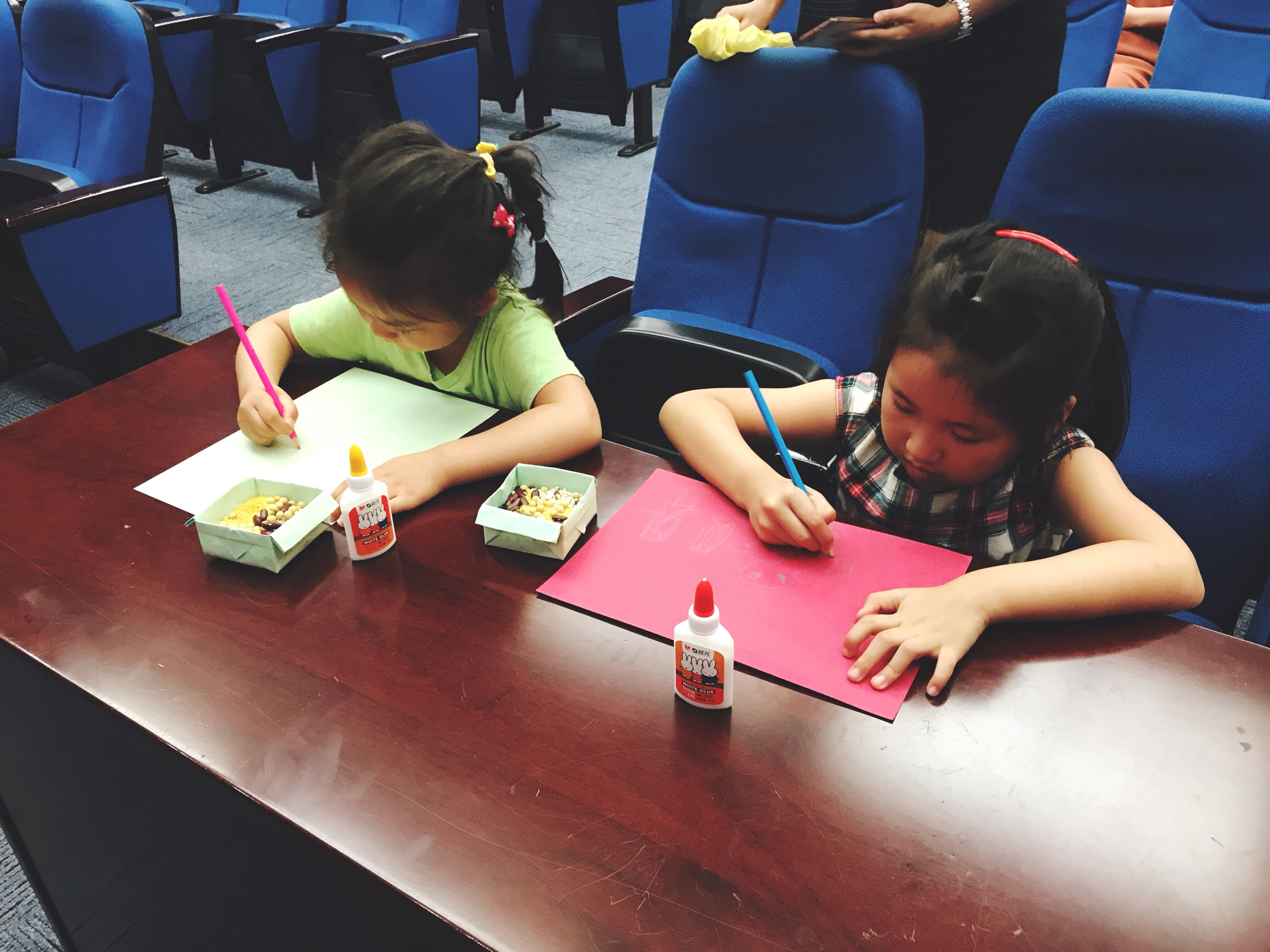 最后主讲人讲解了有关手工作画的方法和技巧以及一些注意事项,手工活动正式开始。小朋友们纷纷上前领取材料,并根据自己的喜好选取了一些不同颜色的豆类,小朋友们“满载而归”,奔向自己的座位开始创作。在他们自己勾画好图案的卡纸上,小朋友们小心翼翼的将豆子裹上白乳胶粘在上面,并在家长的帮助下逐渐地完成了自己的创作。在活动最后,小朋友们拿着自己的手工作品和志愿者们合影,将这一美好记忆保存下来。
