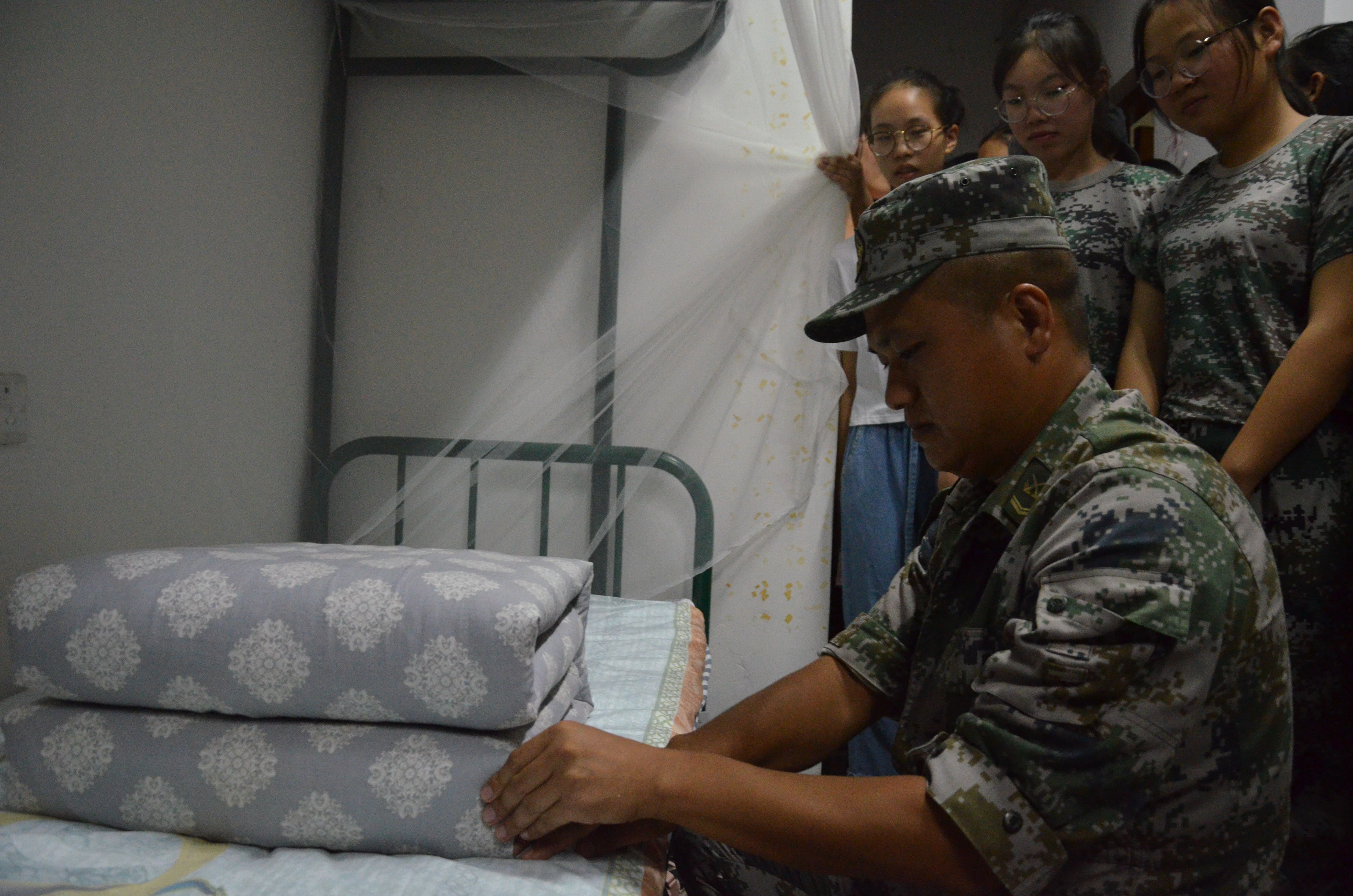 首先,教官们对床铺的整理提出了具体的要求:被褥要平,不能有折痕,被褥边缘不能越过床缘,蚊帐平时应高高挂起,被子、枕头叠放整齐等。讲解过后,教官又亲自示范:如何摊平被褥,如何将被子叠成豆腐块以及被子与枕头的摆放位置。当一个完美的豆腐块在教官手中诞生时,引来了同学们的阵阵惊呼,以及热烈持久的掌声。