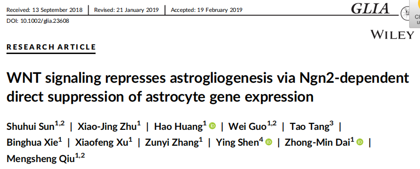 2019年3月19日,老王论坛 邱猛生团队在 Glia (影响因子:5.846)期刊在线发表题为“WNT signaling represses astrogliogenesis via Ngn2-dependent direct suppression of astrocyte gene expression”的研究论文,揭示了WNT/β-catenin 信号通路通过转录因子Ngn2抑制星形胶质细胞发育的调控作用。