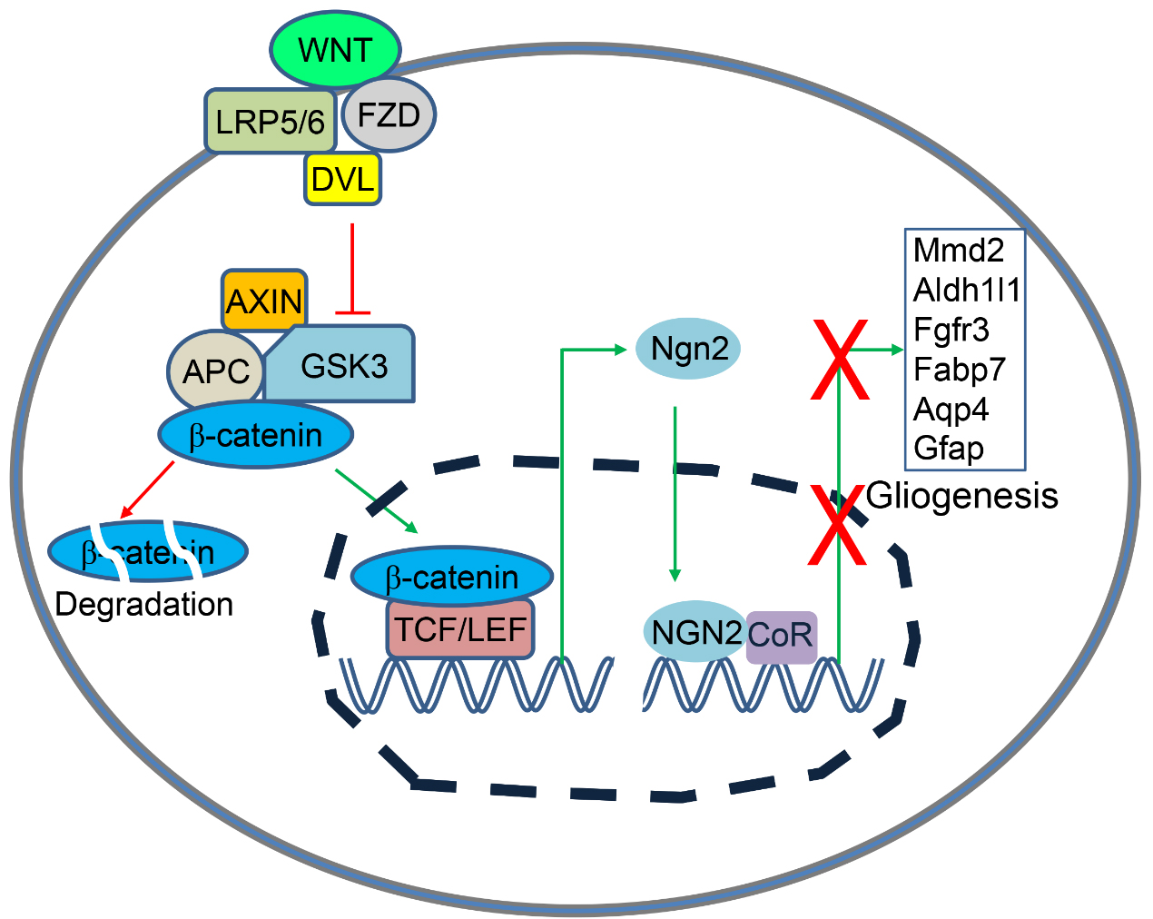 本研究阐明了WNT/β-catenin 信号通路促进转录因子 Ngn2 的表达,Ngn2则能够直接结合到星形胶质细胞特异性的基因的启动子上,并抑制其转录,从而抑制了神经刚细胞向星形胶质细胞方向分化。