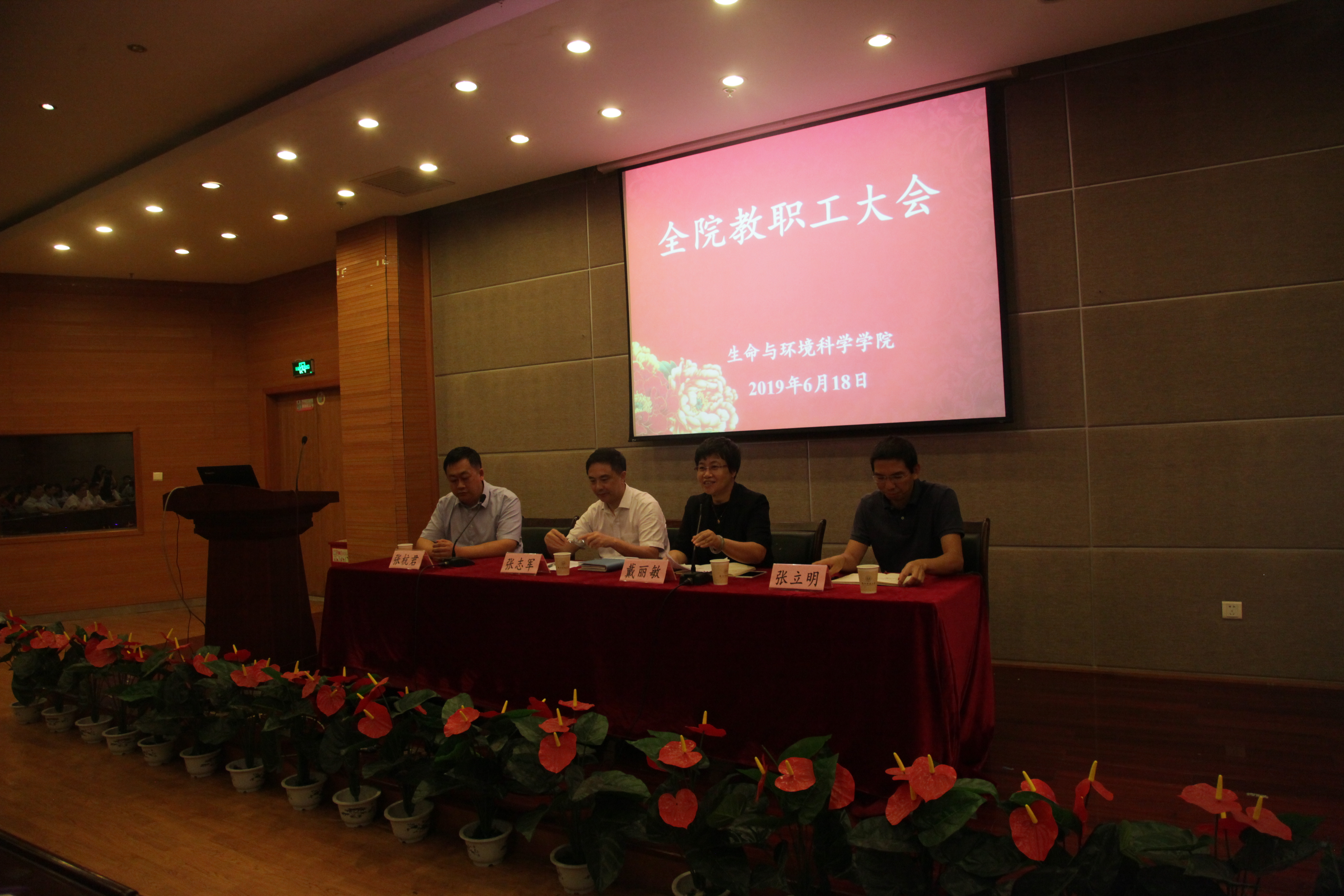 2019年6月18日下午,在下沙行政楼叙伦厅召开老王论坛 全体教职工大会,主要是领导职务任免、部署期末和搬迁相关工作。校党委副书记张志军,校党委委员、组织部长戴丽敏出席会议。