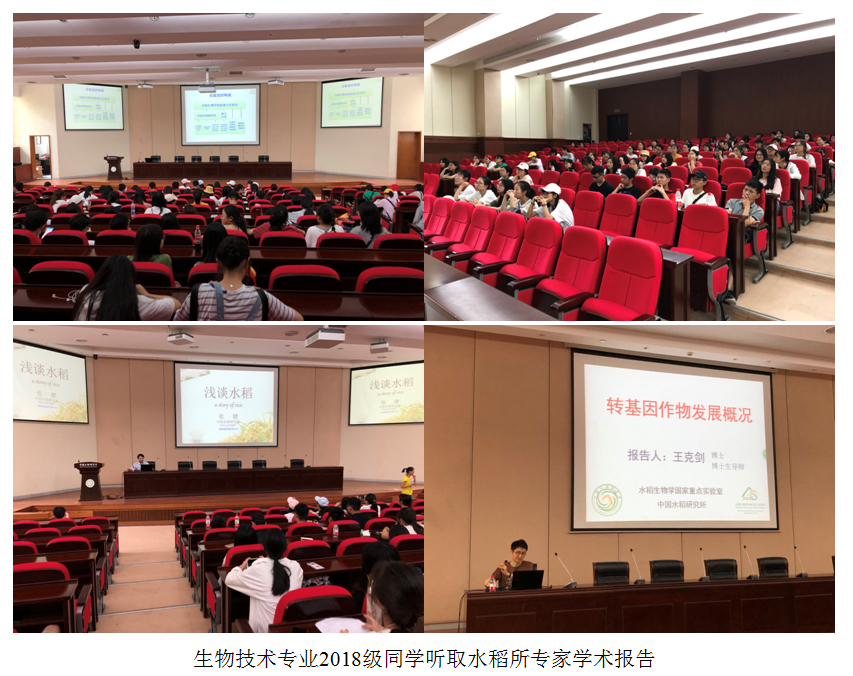 本年度专业见习的第一站是位于富阳的中国水稻研究所。在水稻所,同学们首先听取了张健研究员所做的《浅谈水稻》、王克剑研究员所做的《转基因作物发展概况》两场学术报告,了解了水稻对于国人的重要意义、水稻的种植过程、水稻增产抗病的方式方法、有关于水稻的突破性研究成果等等方面,切身体会了水稻研究的重要意义,了解了这所科研机构正在开展的重要研究课题。另一方面,同学们也初步了解了转基因作物的现状、转基因作物的安全性,以及如何开展转基因实验和评估其效果。