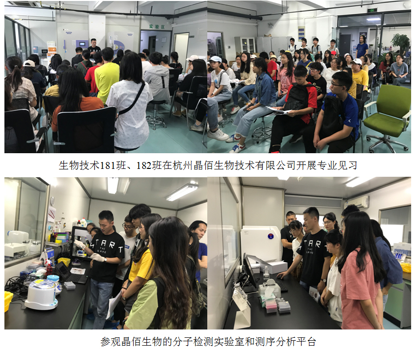 专业见习最后一站是杭州晶佰生物技术有限公司。在晶佰生物,盛东来老师和黄炜老师带领同学们了解了公司的主营业务,参观了公司的分子生物学检测实验室,讲述了实验流程并且示范操作了部分先进的实验仪器,如高通量测序平台、超高敏免疫分析平台等等,使同学们近距离接触了高新实验仪器,感知了生物前沿科技,进一步了解了生物技术产业的发展态势,以及潜在的就业前景。