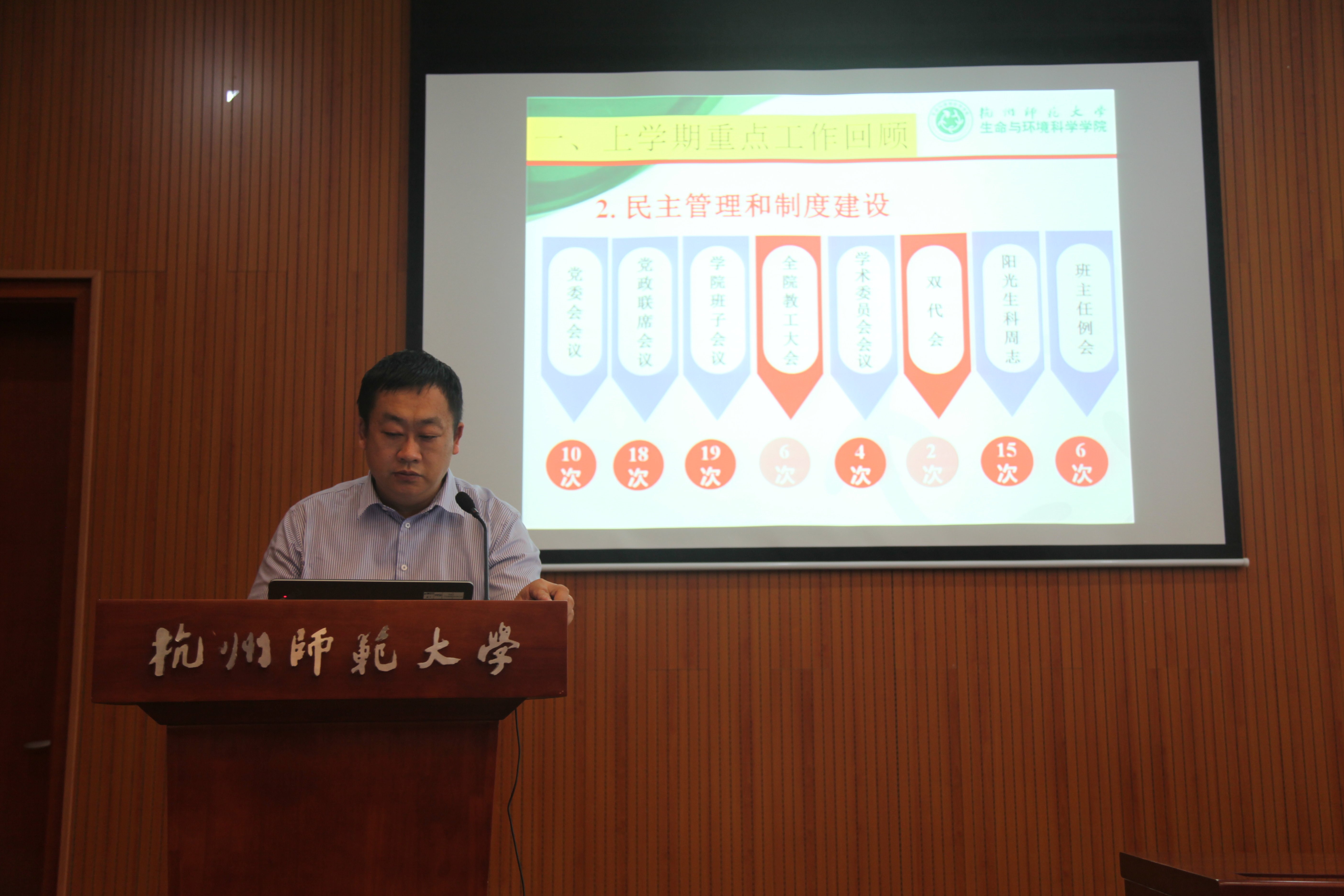 在仓前学术交流中心A-118室召开全院新学期教职工大会。学院全体党政班子成员,全体教职工参加会议。会议由党委副书记余洁主持。 执行院长张杭君代表学院党政班子做了新学期党政工作报告,详细介绍了学院上学期在党建、人才队伍、教学和专业建设,科学研究、学科与学位点、社会服务、教研平台和资产管理、财务、仓前搬迁、国际交流、学生管理、工会活动等各方面工作取得的成绩。张院长在肯定取得成绩的同时也提出了不足,并着重介绍了新学期学院各项重点工作和常规工作。