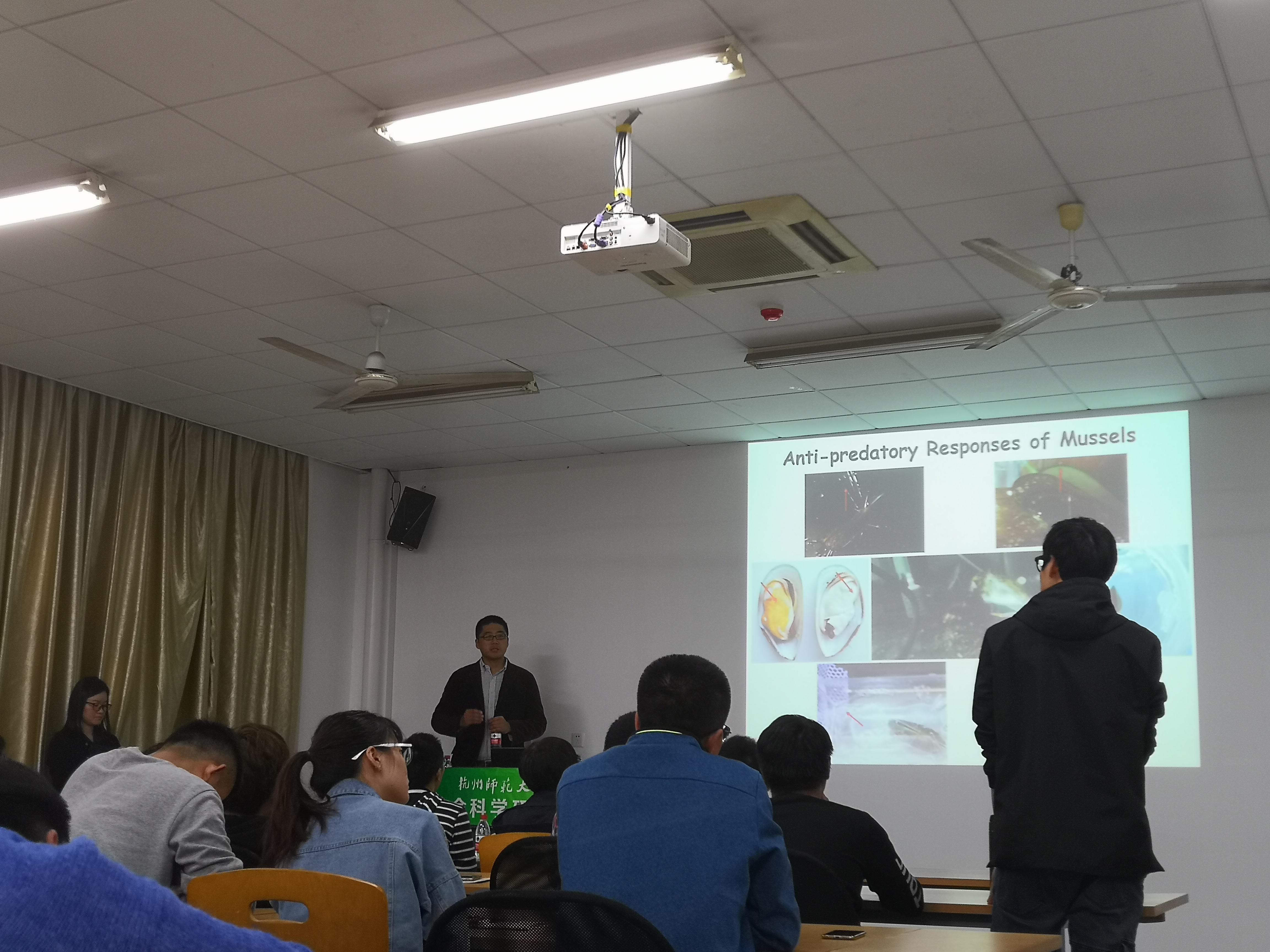 报告内容包括纳米颗粒的特征、背景以及工业应用、纳米颗粒对水生生物造成的毒理效应的过程和机理、贝类吸收纳米颗粒并积累的过程、复合环境与纳米颗粒的胁迫机理、纳米颗粒对贝类消化功能的影响、氧化锌的毒理效应等。与会老师和同学踊跃提问,王有基教授也就纳米颗粒对贝类毒理效应是否影响养殖产量、以及是否会威胁到人体健康、纳米颗粒在贝类体内是如何影响其繁殖以及代谢受阻等问题进行了逐一解答。