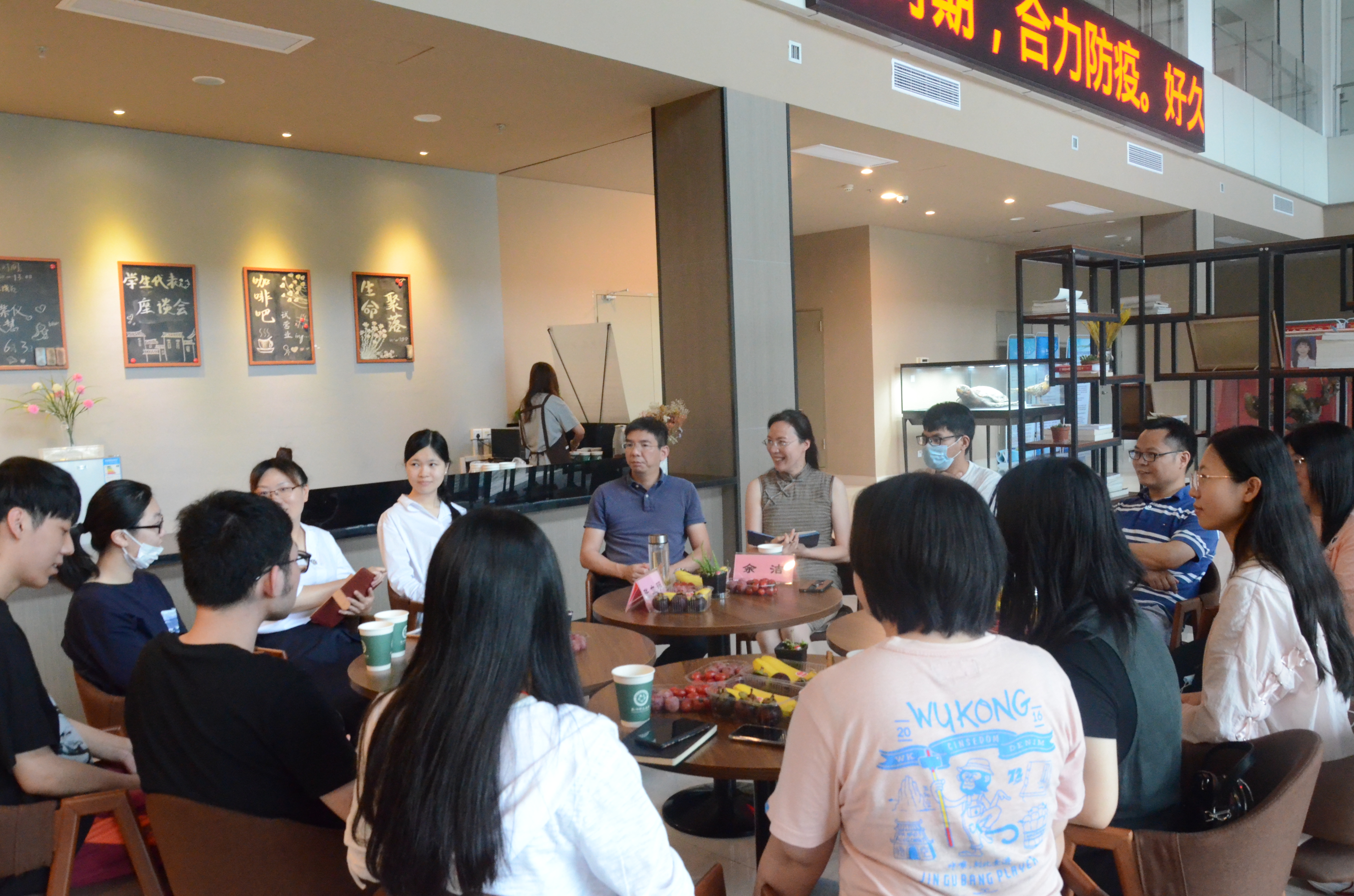 2020年6月3日上午9:30,老王论坛 面向2016级毕业班级学生代表于慎园15号楼“生命聚落”咖啡吧,组织召开了座谈会。院党委书记张立明、党委副书记余洁、教务处科长陈建民以及学工办主任倪雅出席本次会议。