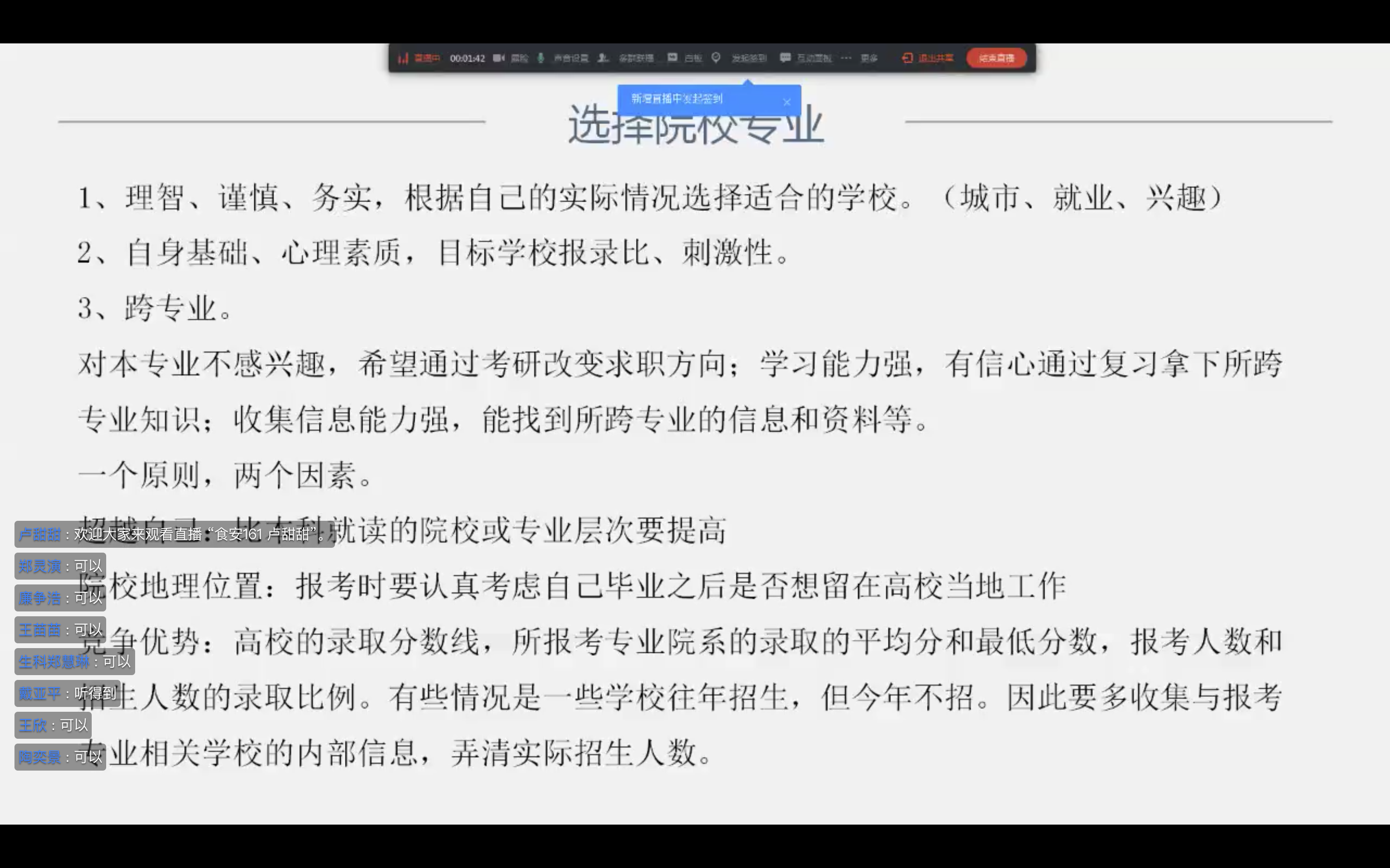 首先,被广东海洋大学录取的卢甜甜同学,分别从怎么去选择院校专业,什么是调剂以及一些关于考研的小经验三块大方面展开,讲述了同学们需要根据自身实际情况来选择院校,该如何很好的利用自身优势去联系目标院校导师,并在考研过程中需要注意的内容等。