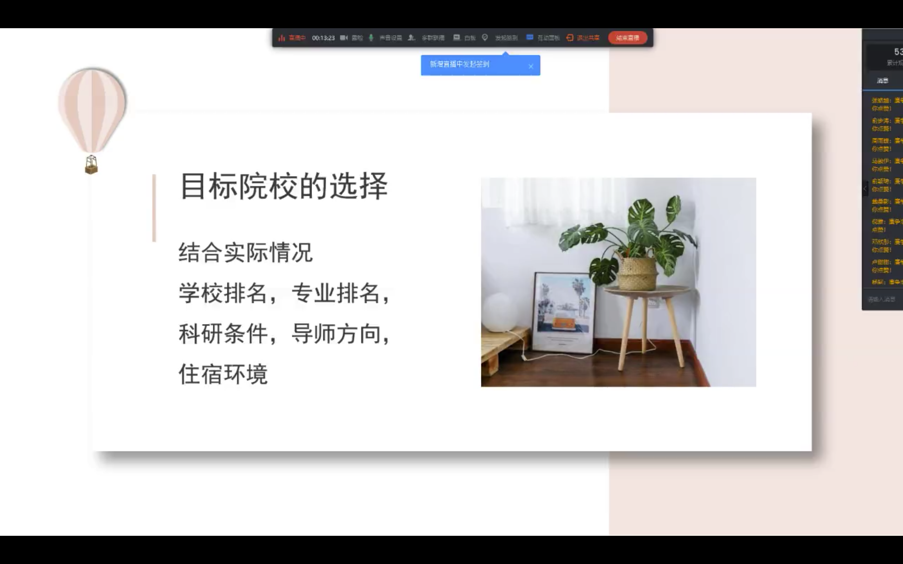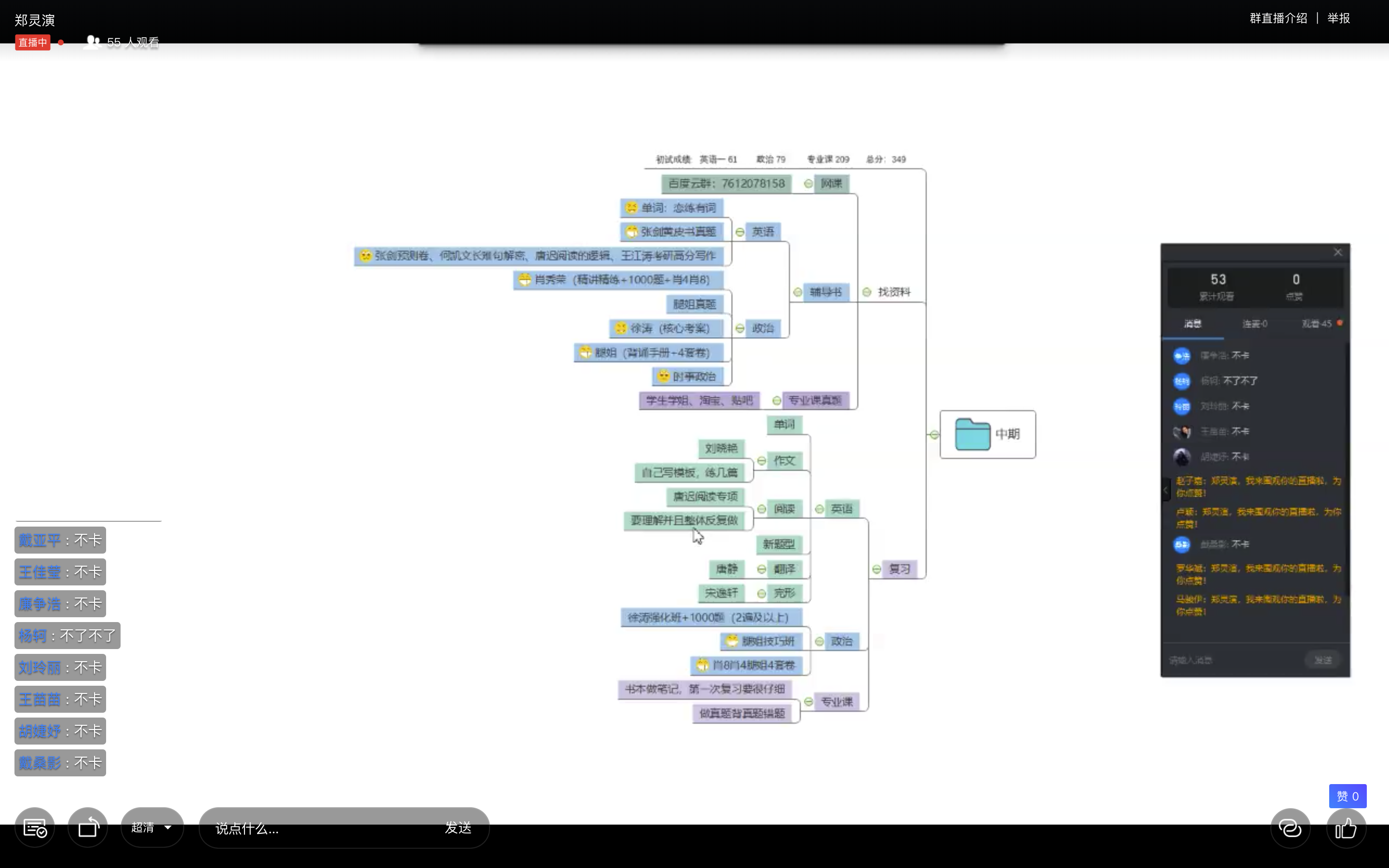 最后,被浙江工业大学录取的郑灵演同学,也详细介绍了自己是如何选择合适自己的院校的并对同学们进行了鼓励,然后她向同学们推荐了适合考研的app以及详细介绍了各个考研资料的利弊,再次,她也分享了复试前、复试中、复试后所需要注意的事项。