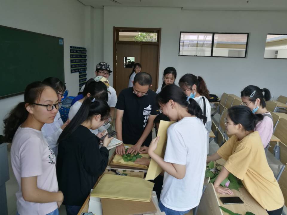 在植物学野外实习中压制标本、进行分类定种