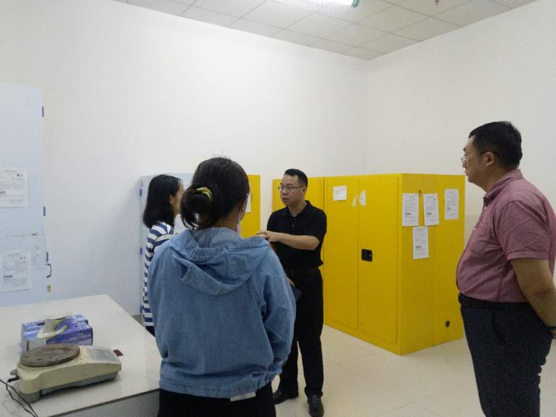 首先,赵飞处长检查学院的危化品室,指出安全工作重于泰山。对危化品的管理要严格按照学校危险化学品的规范管理要求,尽可能减少学院危化品室易制爆化学品的存储量,营造安全良好的教学、科研环境。