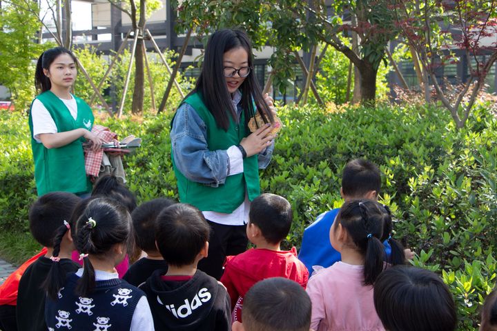 志愿者带领小朋友认识植物