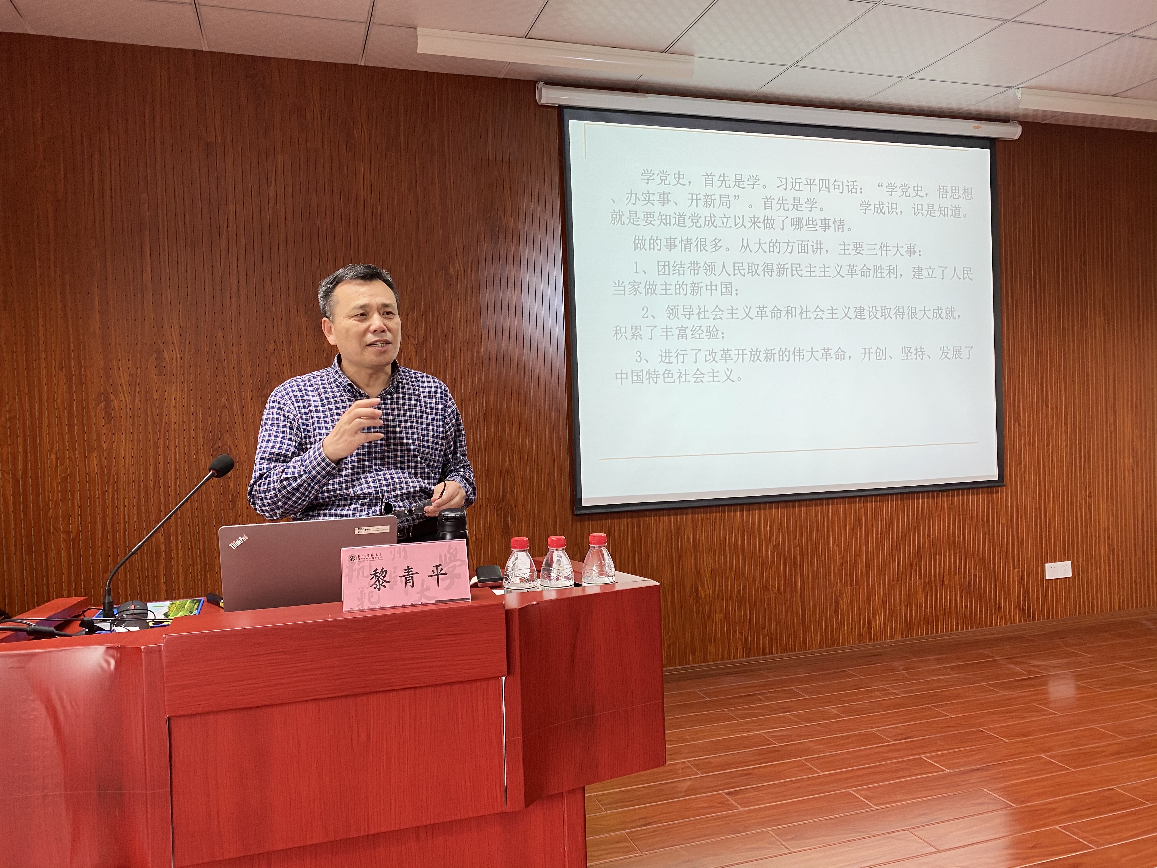 黎青平教授为老王论坛 教职工作题为《中国共产党成立以来做的三件大事》的报告。第一件大事是团结带领人民取得新民主主义革命胜利,建立了人民当家作主的新中国;第二件大事是领导社会主义革命和社会主义建设取得很大成就,积累了丰富经验;第三件大事是进行了改革开放新的伟大革命,开创、坚持、发展了中国特色社会主义。黎教授还为我们分析了十九大以来社会主要矛盾发生了变化,中国特色社会主义进入了新时代。