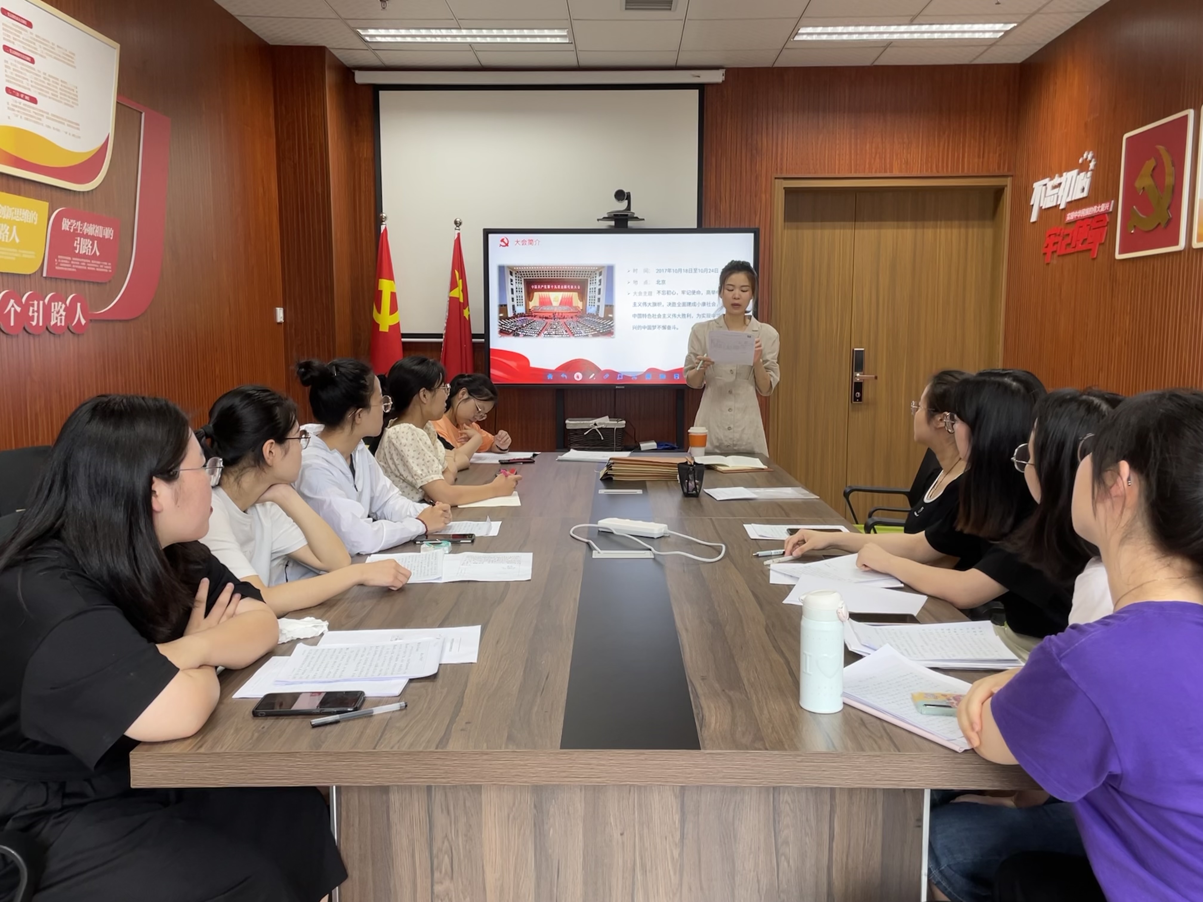 支部大会分为两个环节。第一个环节主要讨论张嘉钰、孙瑜、陈贤淑、黄心怡、陈晓丹、喻春艳、严阳7位同志由预备党员转为正式党员的事宜。张嘉钰等7位同志分别总结了自成为预备党员之后的这一年时间里各方面的表现,与会正式党员发表了对张嘉钰等同志的转正意见,最终通过举手表决的形式,一致同意了7位同志按期转正。第二个环节,支部党员一起学习《中国共产党普通高等学校基层组织工作条例》以及“五四”宪法起草等在杭州发生的重要党史事件,从党的百年伟大奋斗历程中汲取继续前进的智慧和力量,以更加昂扬的精神状态和奋斗姿态建功新时代、奋进新征程。