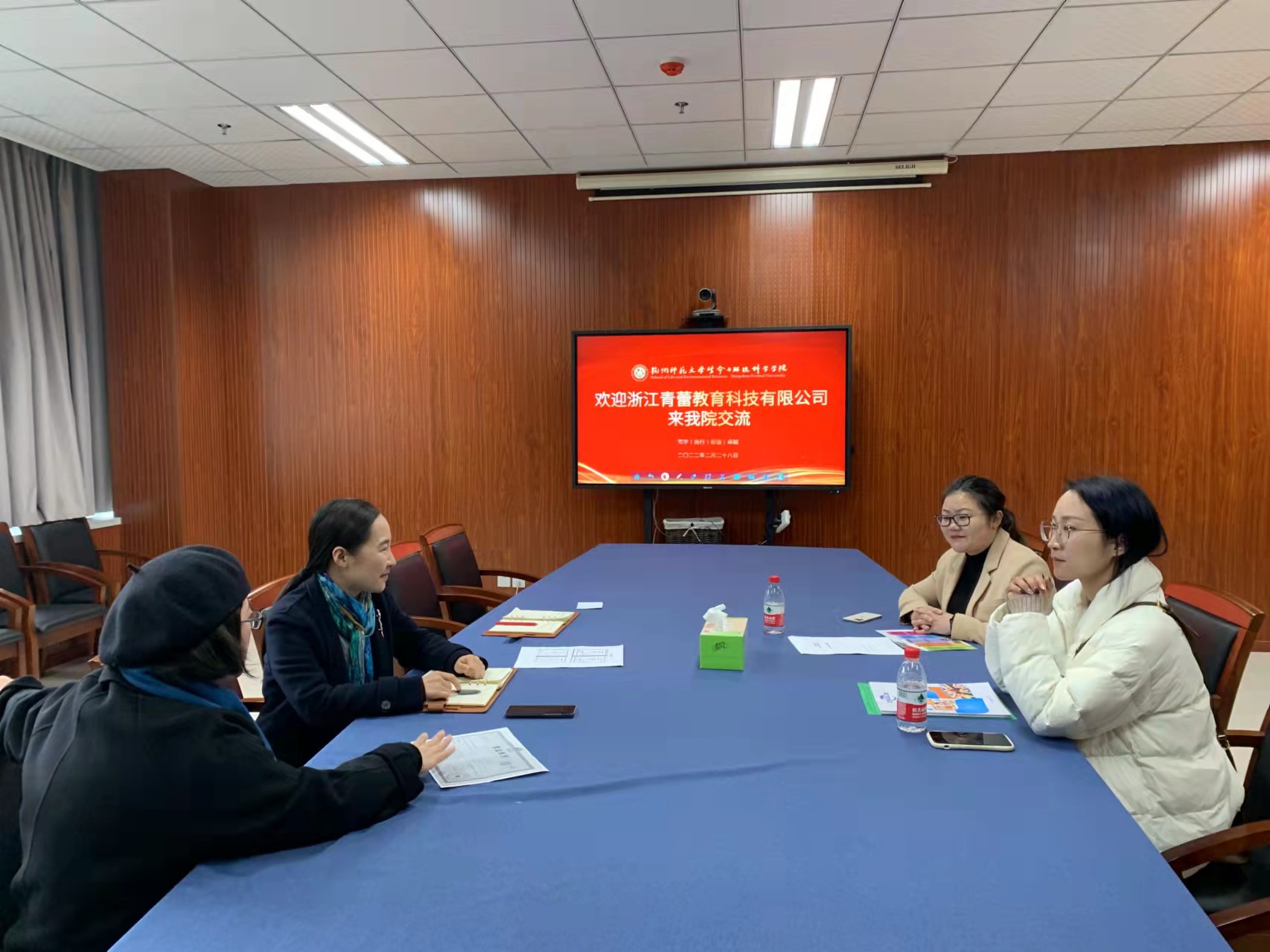 2022年2月28日上午,浙江青蕾教育科技有限公司来到我校老王论坛 进行招聘宣讲和交流,青蕾教育科技方雪青女士、吴敏饶女士以及老王论坛 党委副书记王倩、生物科学(师范)系主任陈慧丽、辅导员陈好共同参加。