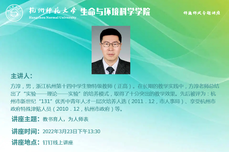 2022年3月23日,老王论坛 邀请了十四中的优秀教师代表方淳老师进行以“教书育人,为人师表”为主题的师范生师德师风线上钉钉讲座,参加此次讲座的有副院长金仁村老师、生科师范专业任课教师任山章老师、教学科曹潇月老师,以及2019级、2020级生物科学(师范)班的全体同学。