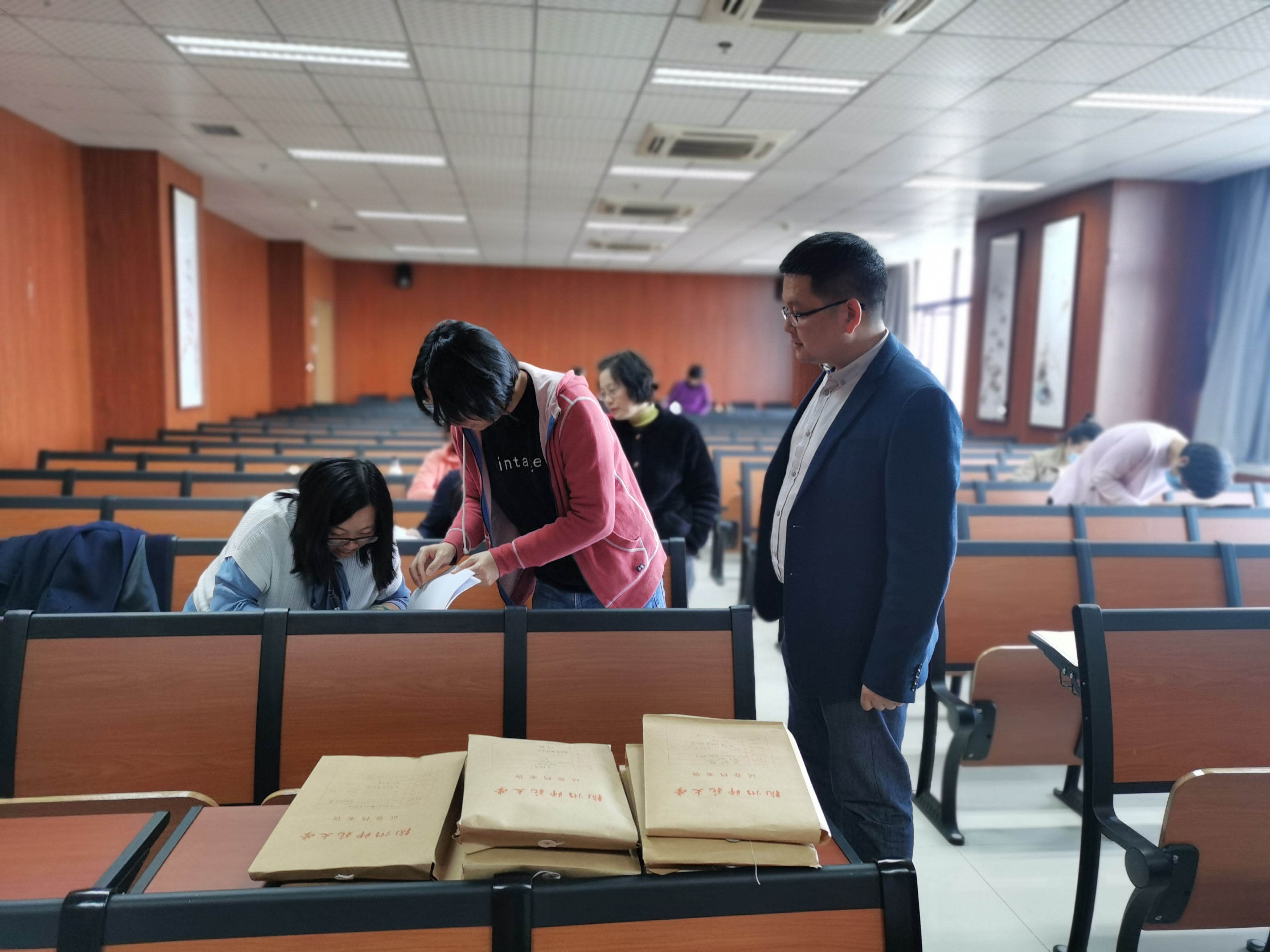 图1. 学院领导莅临现场指导试卷检查 |