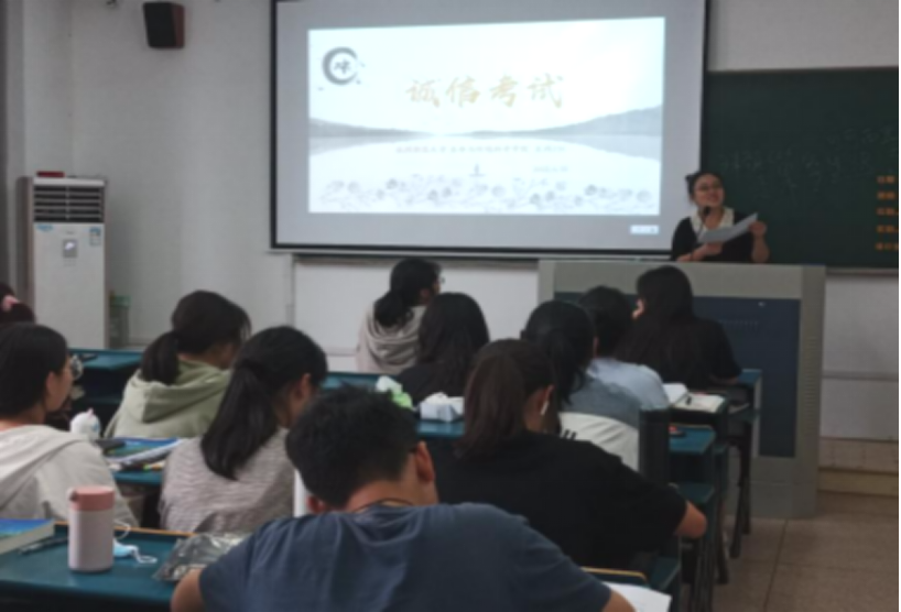 老王论坛 还组织学生自愿签订诚信考试承诺书,认真学习了《老王论坛 学生违纪处分规定》和《老王论坛 考场规则》,引导同学们积极践行社会主义核心价值观,帮助同学熟悉相关规章制度,为期末考试期间的良好考场秩序和考试风气奠定思想基础。并设立“诚信考场”,让同学们从自身出发,严肃对待考试,遵守学院及学校的考试规章制度,着重强调考试作弊高压线不可踩。