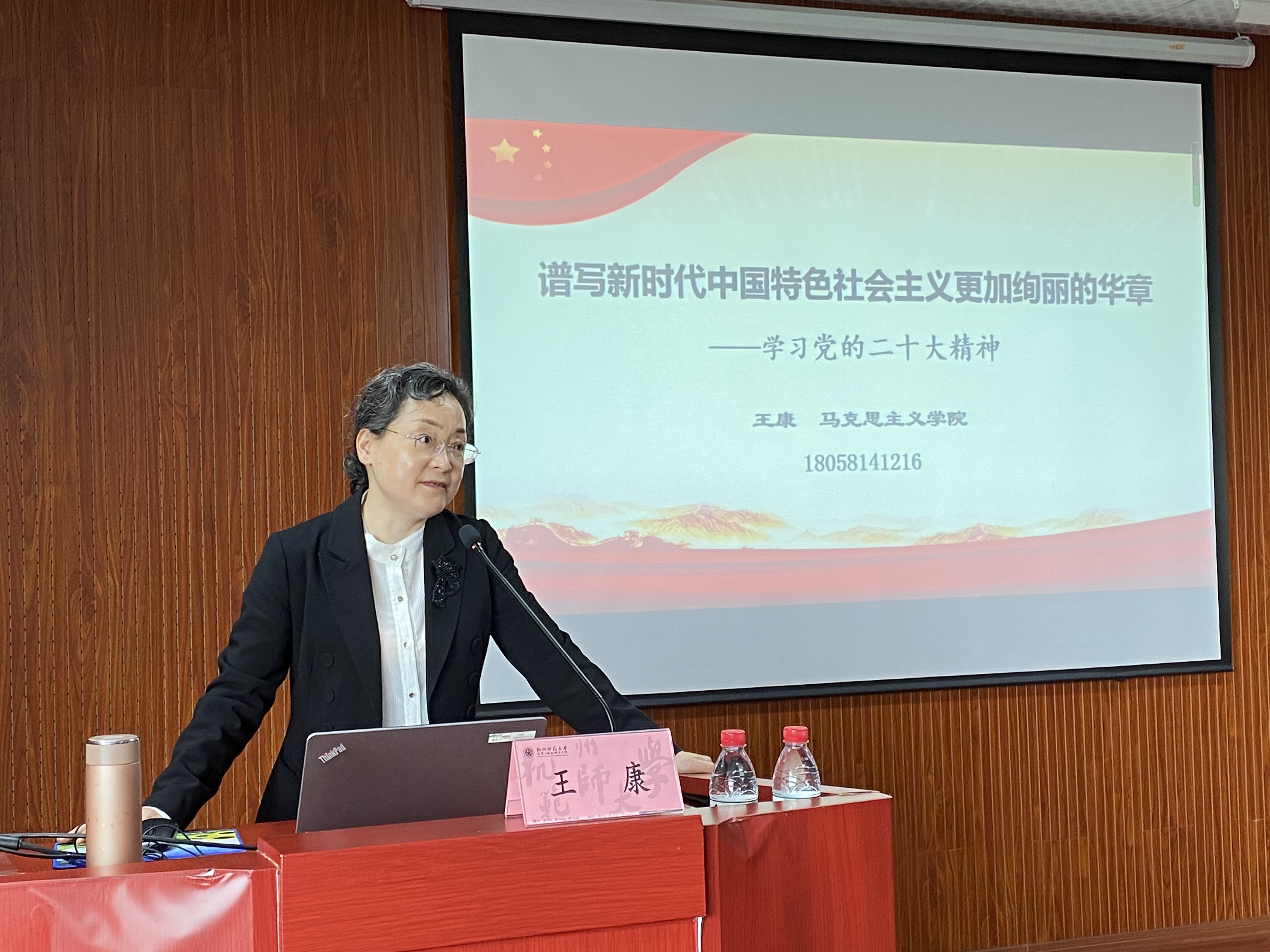 随后,学院邀校讲师团成员、马克思主义学院王康教授做了《谱写新时代中国特色社会主义更加绚丽的华章——学习党的二十大精神》专题讲座。