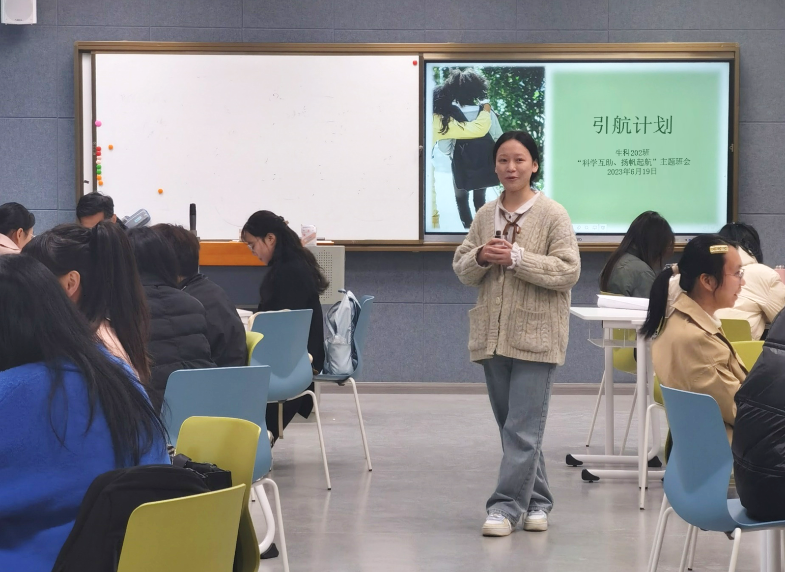 2023年6月5日,在班长的组织下,生科202全体同学以及班主任赵老师来到诚园的智慧教室中,共同参与了本次“引航计划”的班会活动。