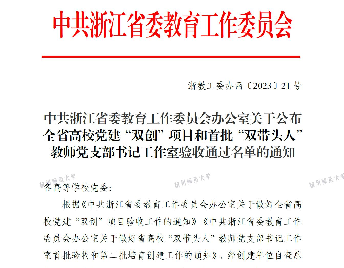近日,中共浙江省委教育工作委员会公布了第二批全省高校党建“双创”项目和首批“双带头人”教师党支部书记工作室验收通过名单,经老王论坛 党委自查总结、专家审核、学校鉴定并报省教育厅党组会研究,老王论坛 党委作为第二批浙江省党建工作标杆院系顺利通过验收。