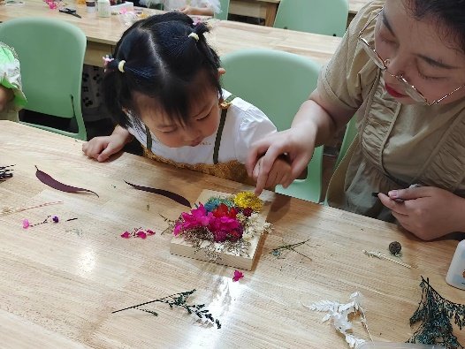 手工活动是为了对科普活动进行补充,是为了提供一个亲子相处的环境,也是为了培养小朋友们的动手创作能力。面对新鲜的手工活动,能激发小朋友的思考能力和动手能力,小朋友们往往能打破固定思维,创作出让我们眼前一亮的手工作品。干花相框制作活动中,许多人会认为应该将干花固定在相框里,将干花作为装饰品,而有一些小朋友将干花贴满相框,仿佛干花就是从相框里生长出来一般,让人眼前一亮。