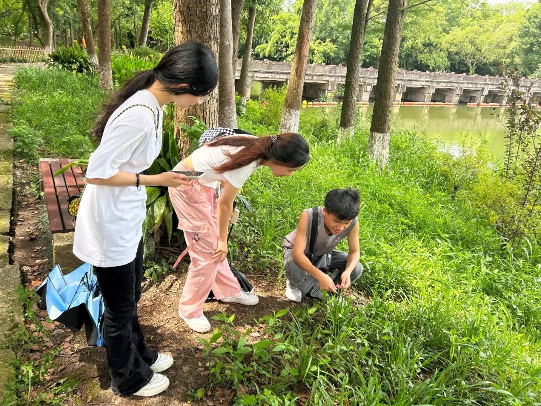 我们西溪湿地动植物调查小分队不惧炎炎烈日,来到了中国“十大魅力湿地”之一的西溪国家湿地公园的南端——周家村。在考察植物的过程中,我们会用手机对植物拍摄三张照片,这三张照片分别展现:植物的生活环境、植物的整体样貌、植物的识别特征。我们会在拍摄照片的时候仔细地去观察植物地特征,然后用自己已学习到的知识去判断该植物。但是有时候我们的储备知识实在是有限,没有办法辨别出植物。这时候我们就会掏出手机微信里面的小程序“形色识花”,动用科技的力量来帮助我们学习。