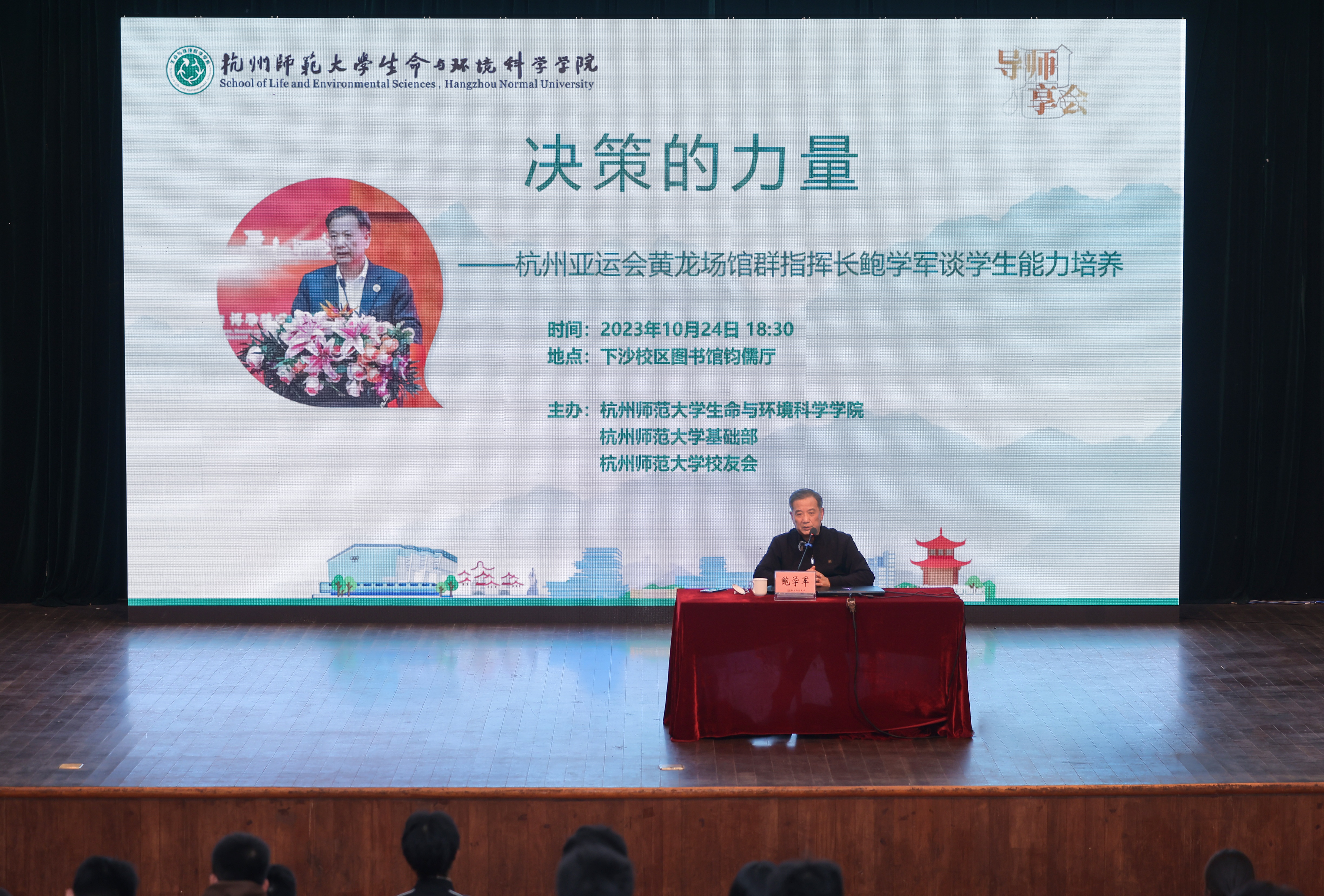 鲍学军从成功的杭州亚运会、亚运会的机遇与对决策能力的挑战以及黄龙场馆群的决策几个方面,通过大量实例与现场同学分享了什么是决策、可能遇到哪些事情需要决策、如何去决策,提出了培养决策能力的重要性以及培养路径。他指出,日常工作离不开选择和决定,做好行政工作必须有决策决定能力,决策的基础是了解情况、分析规律、抓住重点、解决问题、趋利避害;决策能力需要积累,当然也可以自我培养。他强调,要培养决策力,就要先把书读厚,再把书读薄,培养删繁就简、抓住主要矛盾的能力,并且既要读有字之书,也要读无字之书,不断丰富经历,并积极向周围的人学习。最后,他勉励同学们要培养自己分析实际问题的能力,学会独立思考、辩证思考,学会选择与决定,学会承担责任,成为一名有担当、有作为的人。