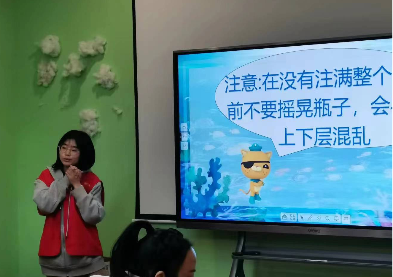 一点二十分,小朋友们在家长的陪同下陆陆续续来到博物馆一楼活动教室。一点三十分,活动正式开始。由赵科婷和叶美玲为小朋友们讲解海洋污染的从哪里来,会造成什么样的危害。为了更好的展现美丽海底世界,传递保护海洋环境,珍惜海洋的美丽的意识,志愿者们还为小朋友们演示了“火山喷发”小实验,彩色气泡不断涌出,就像海底世界一样奇妙。