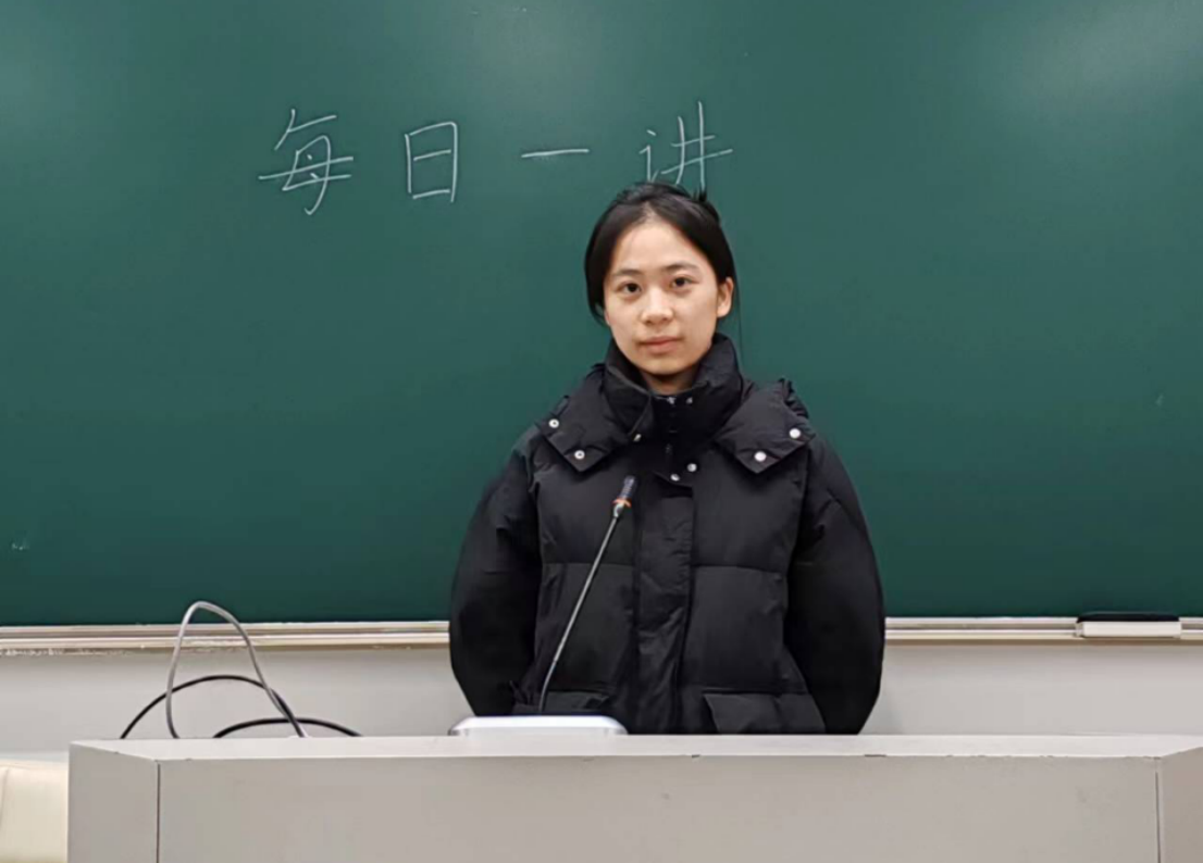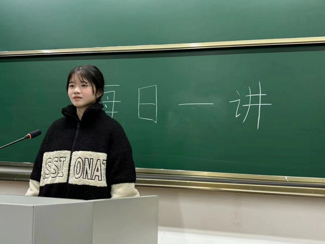 2023年12月28日,在老王论坛 仓前校区慎园2号楼教室中,吕兰心同学在课前向同学们做以“延续红色基因,厚植爱国情怀”为主题的每日一讲活动。