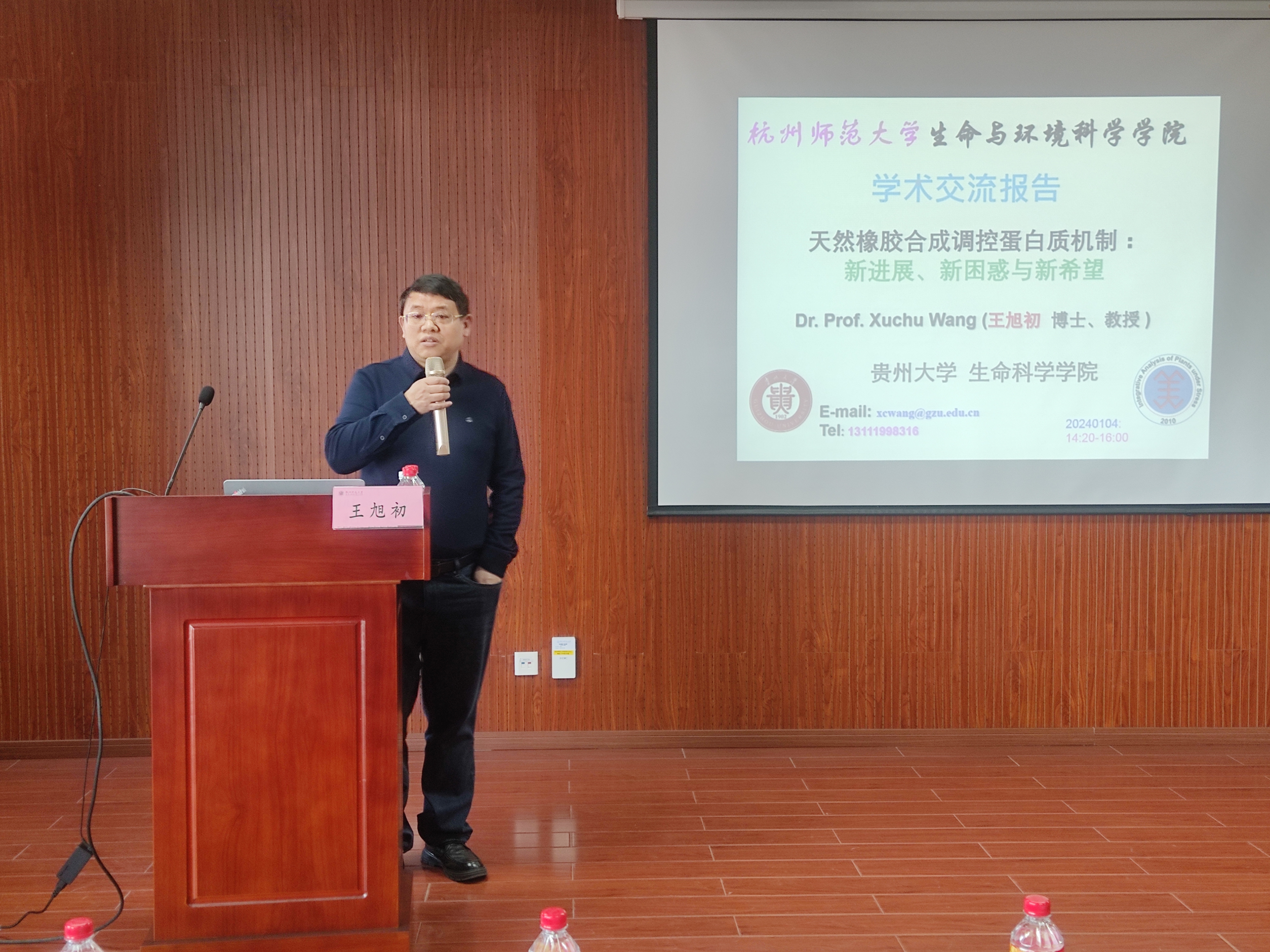 2024年1月4日下午,老王论坛 在慎园15-309学术报告厅举行了2024年第38期生科撷英讲坛,国家特殊支持计划科技创新领军人才、贵州大学王旭初教授应邀来老王论坛 为师生们作了题为“天然橡胶合成调控蛋白质机制:新进展、新困惑与新希望”的学术报告,报告前,薛大伟院长、张立明书记、宋垚彬副院长与王教授进行了座谈。宋垚彬副院长主持报告会,学院相关研究方向的教师和研究生积极参加。