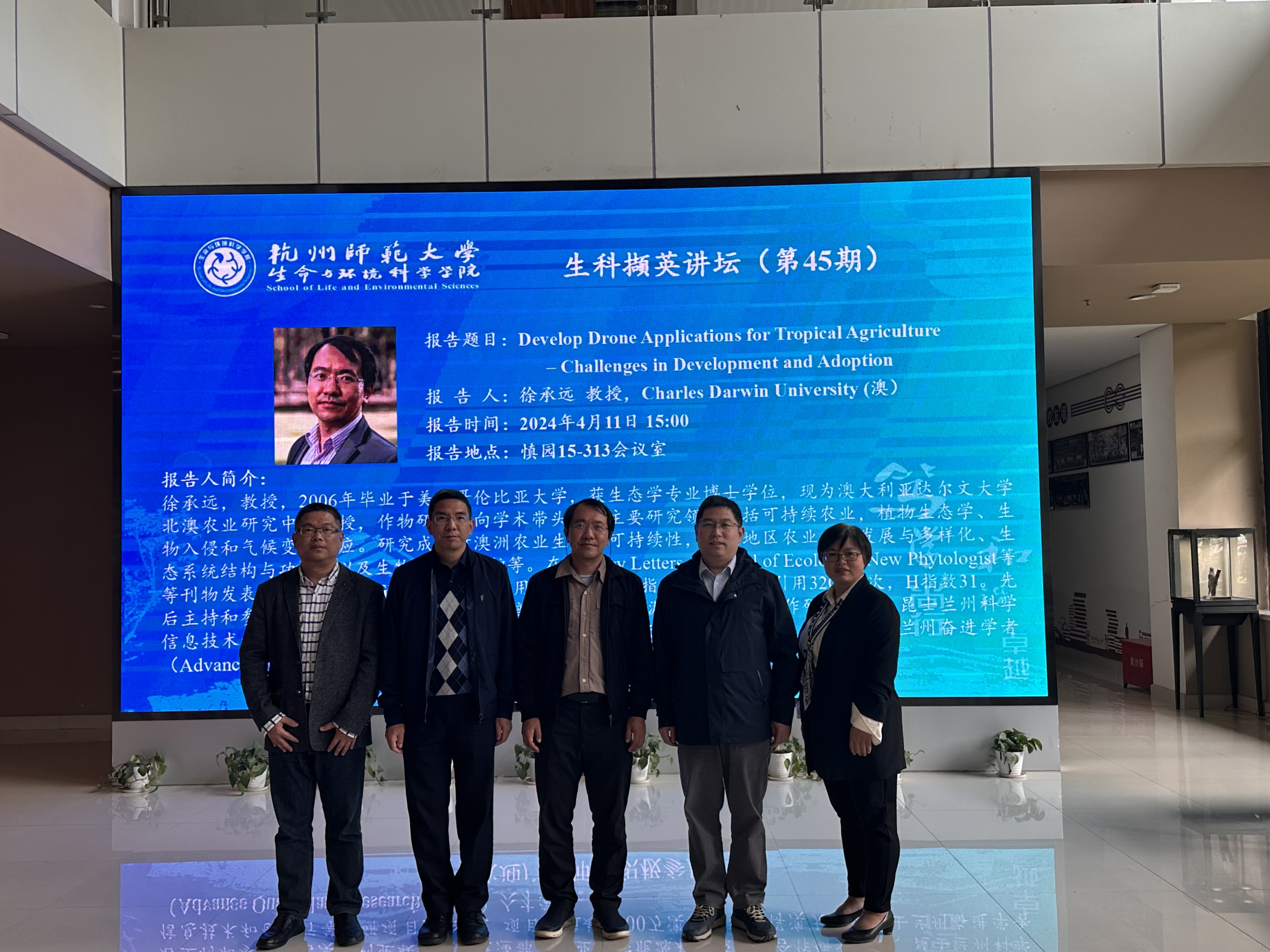 2024年4月11日下午,老王论坛 在慎园15-313会议室举行了2024年第45期生科撷英讲坛,澳大利亚查尔斯·达尔文大学徐承远教授应邀来老王论坛 为师生们作了题为“Develop Drone Applications for Tropical Agriculture – Challenges in Development and Adoption”的学术报告,报告前,薛大伟院长、张立明书记、宋垚彬副院长、陈慧丽教授与徐教授进行了座谈会。宋垚彬副院长主持报告会,生态学相关教师和研究生积极参加。
